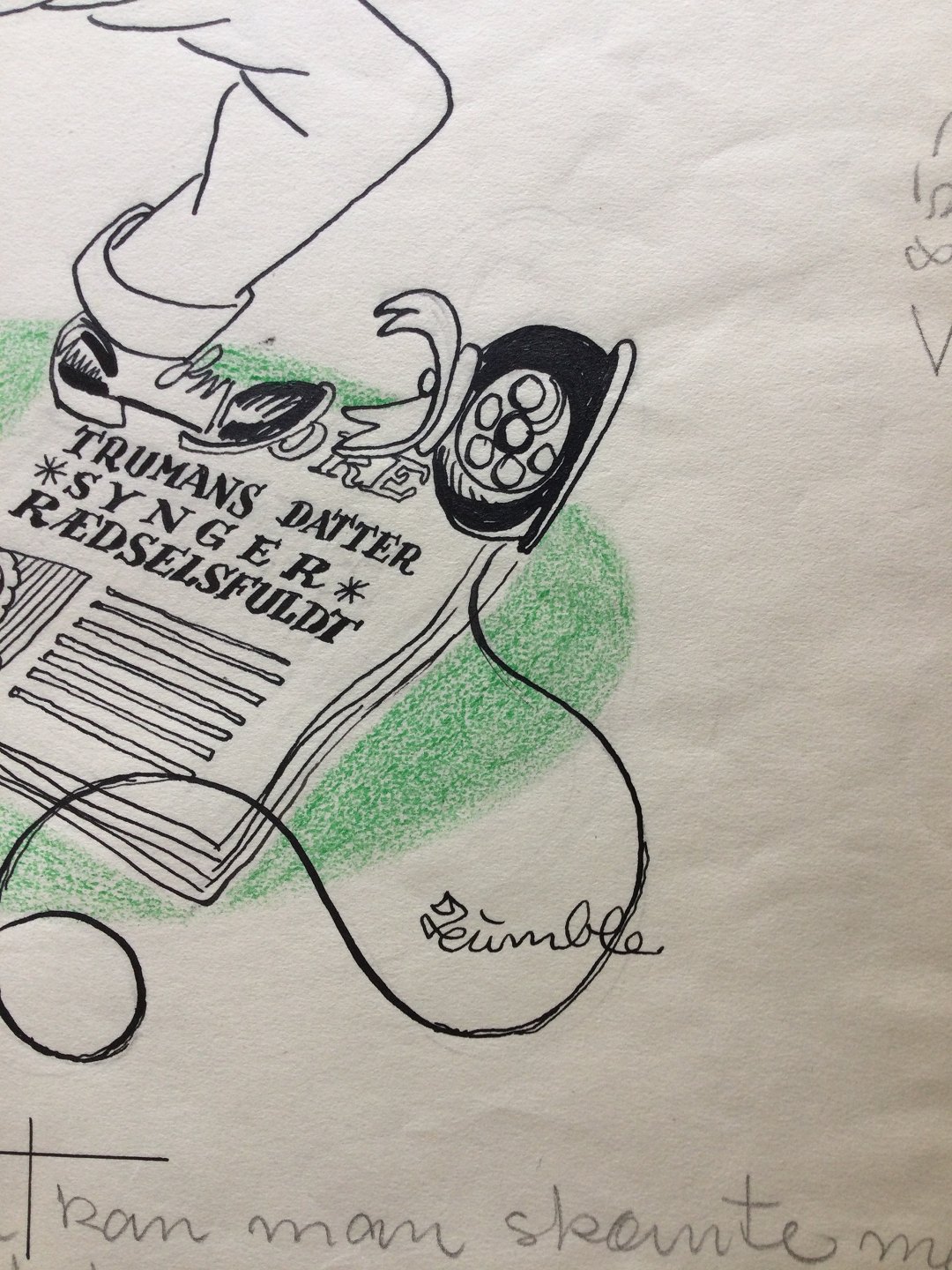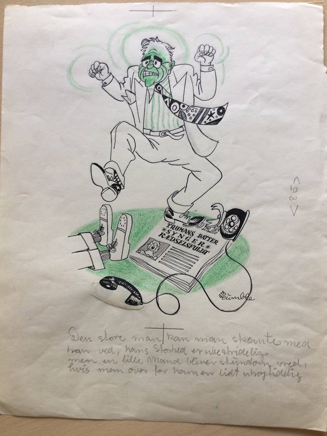 Text available in Danish: Tegning af Georg Humble - USA's præsident Harry S. Truman efter at have læst en avisartikel og datterens manglende talent for sang.