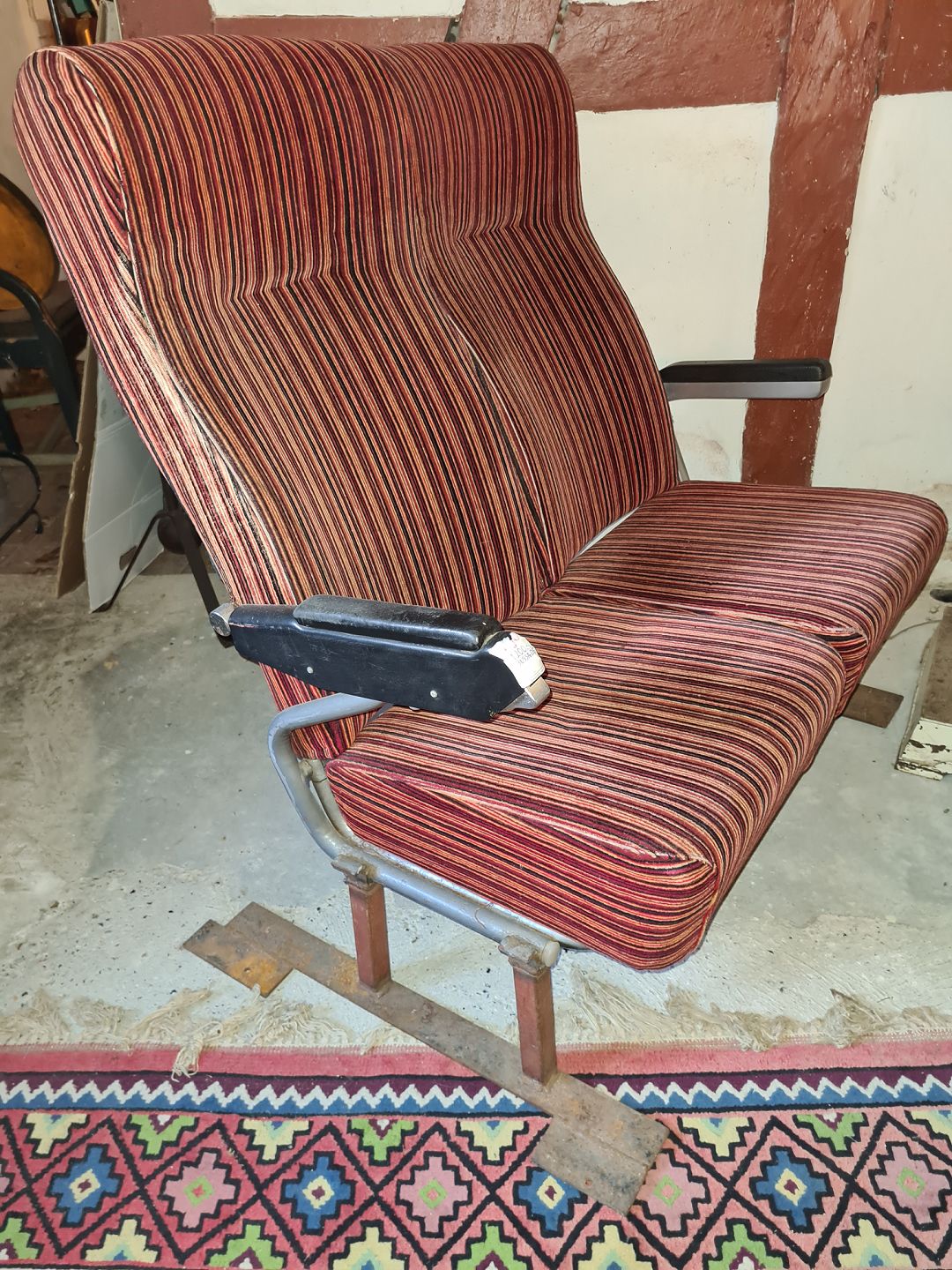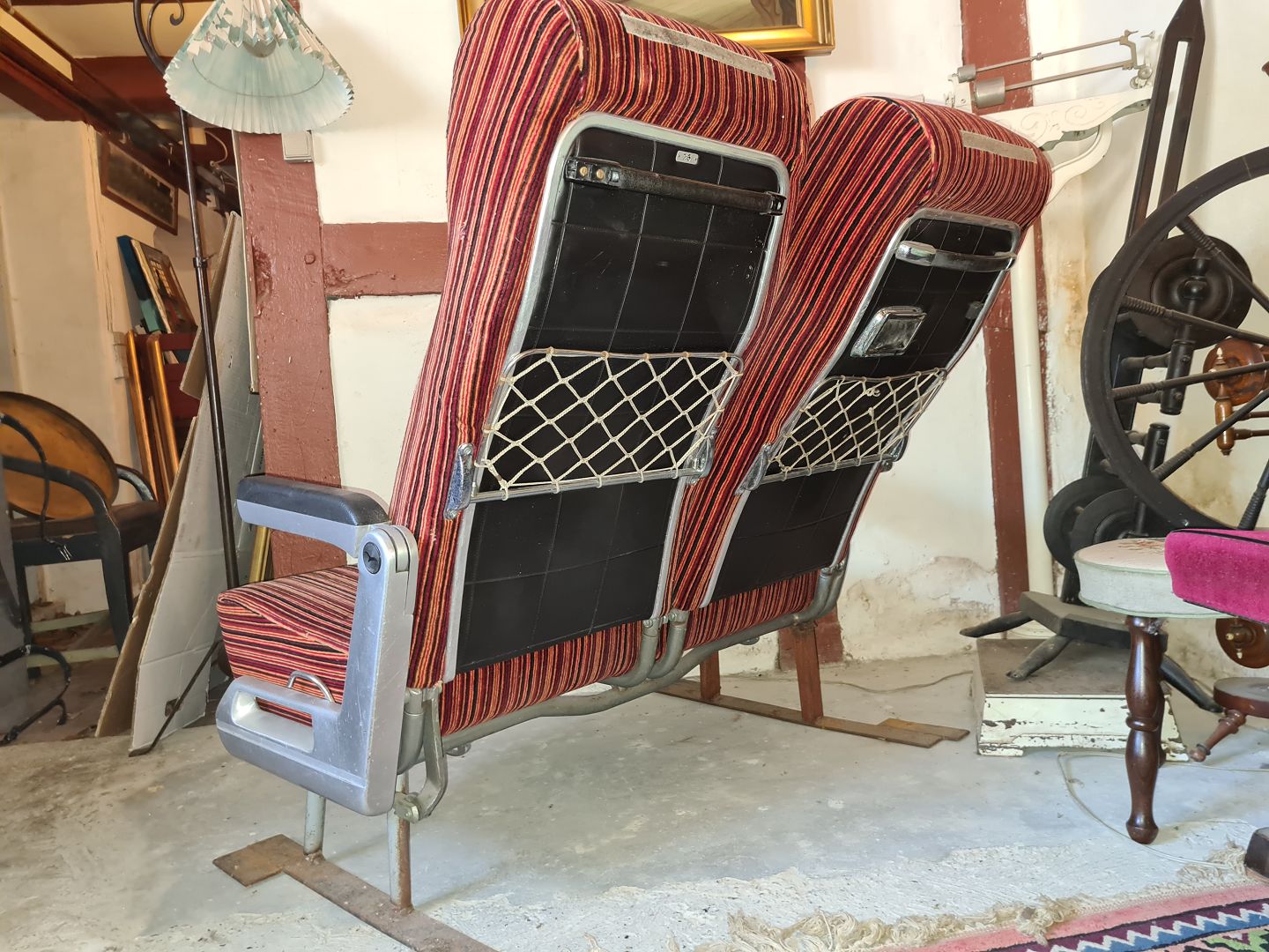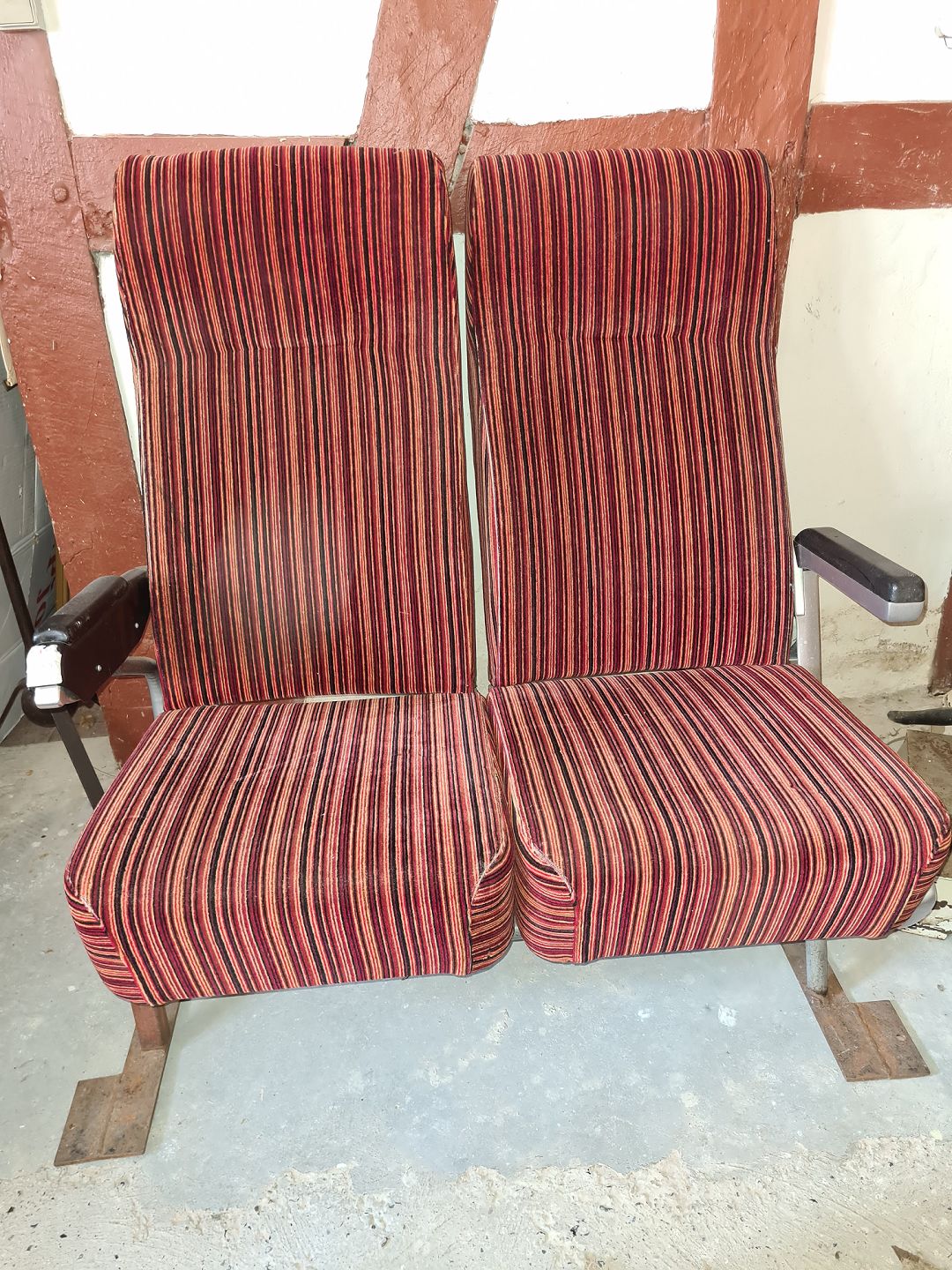 Dobbelt passagersæde. Fremstillet til en bus i 1960´erne. Fremstår udmærket stabile med en lettere falmen på sæderne. Ryggen kan skubbes tilbage på sædet til venstre.