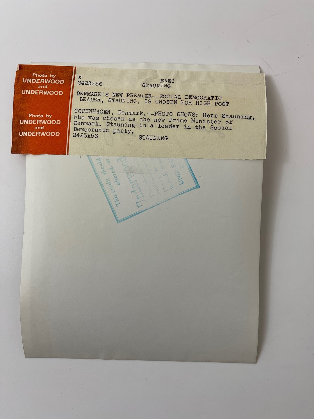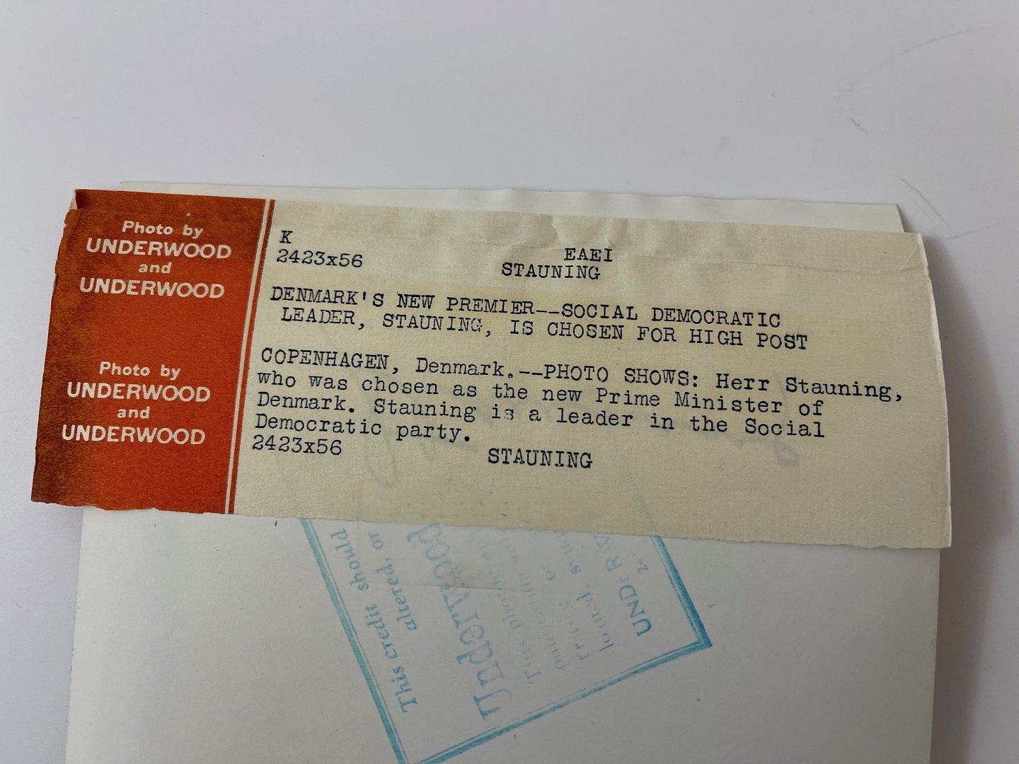Originalt vintage, pressefoto i sort / hvid af statsminister Thorvald Stauning, Socialdemokratiet, fra 1929, gelatine silver.