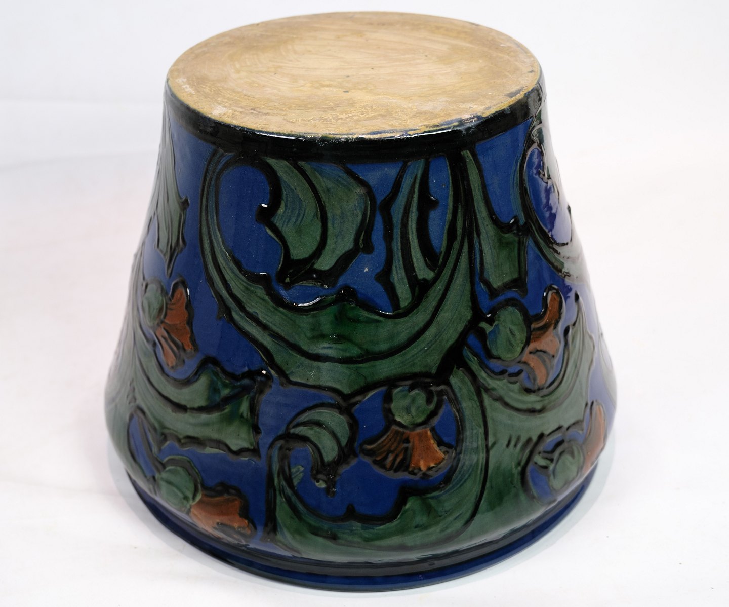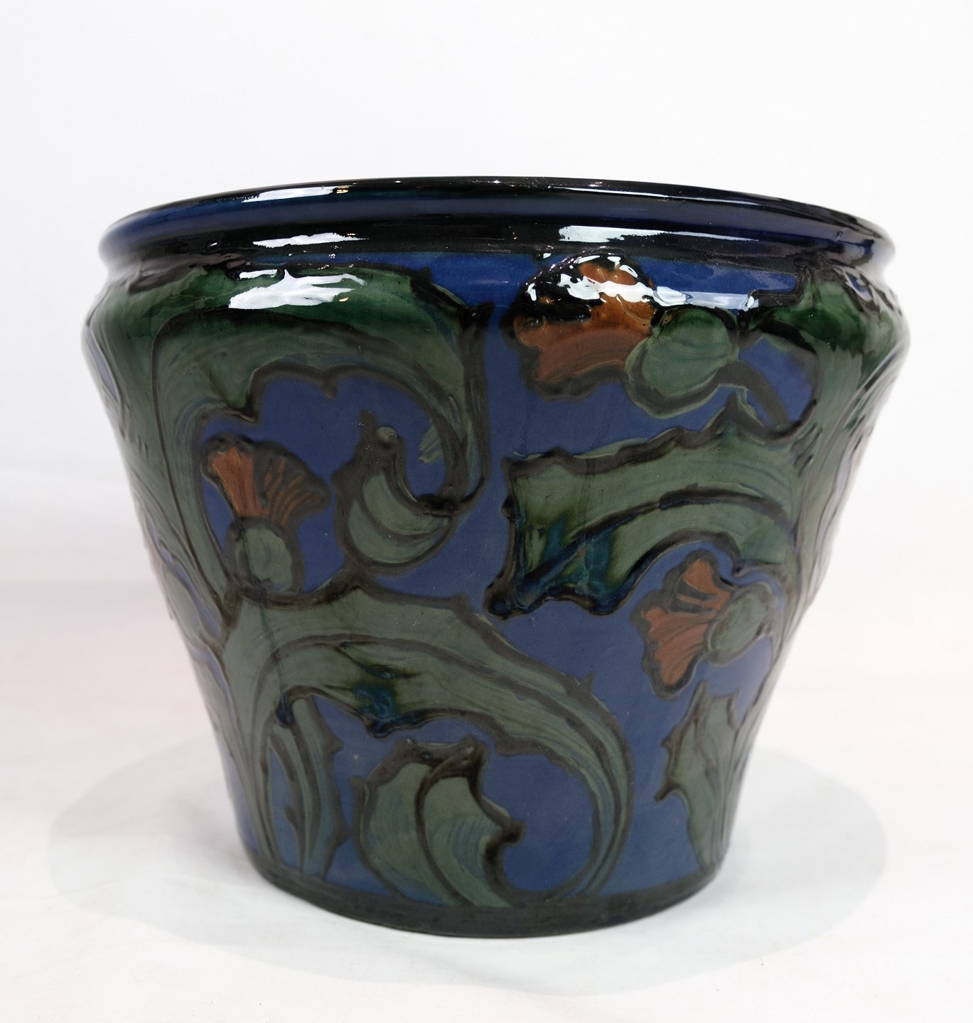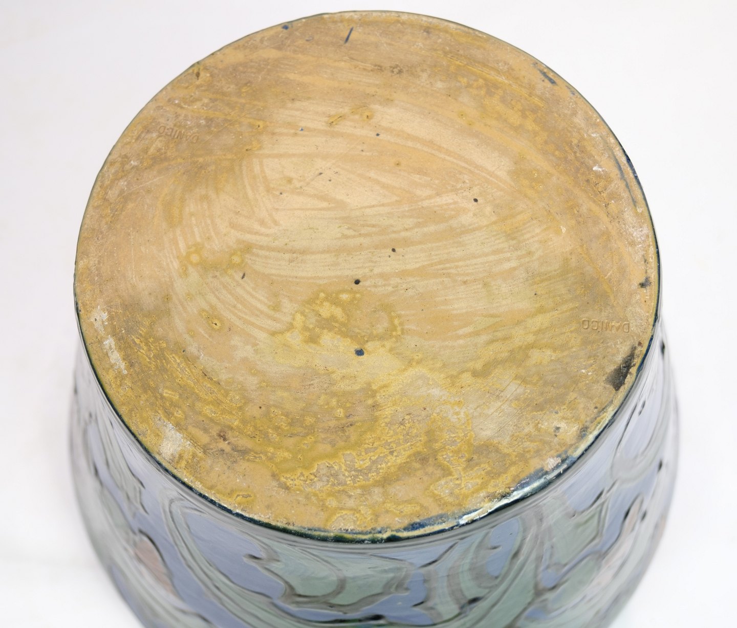 Stor blomster kumme i Danico keramik med blå og grønlige farver fra omkring 1960'erne.