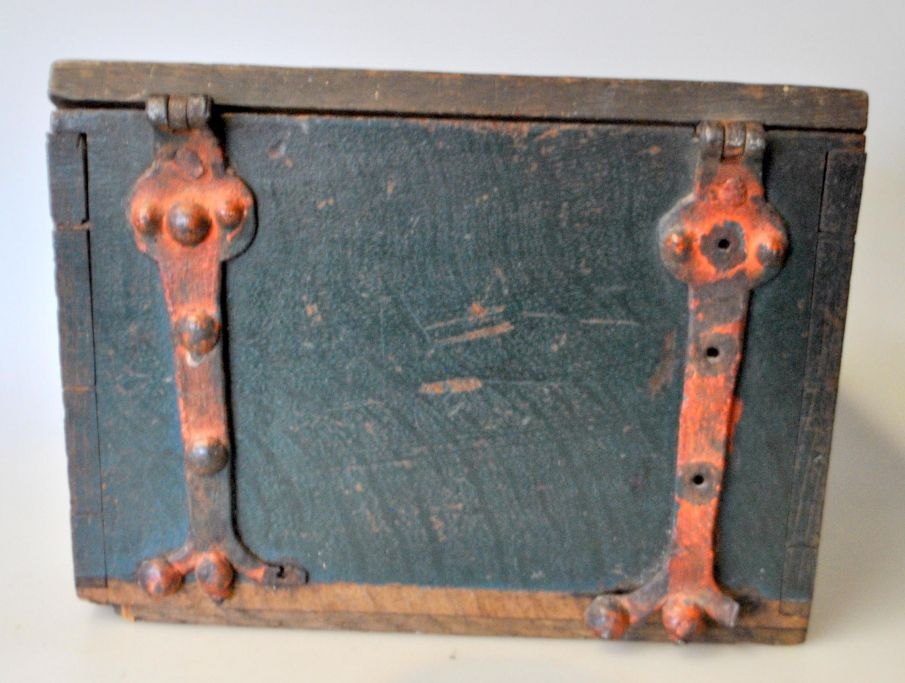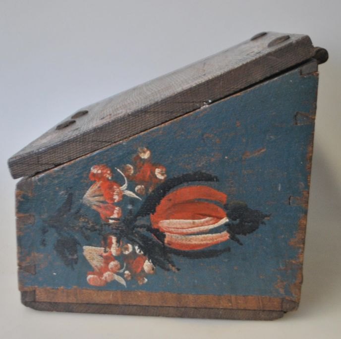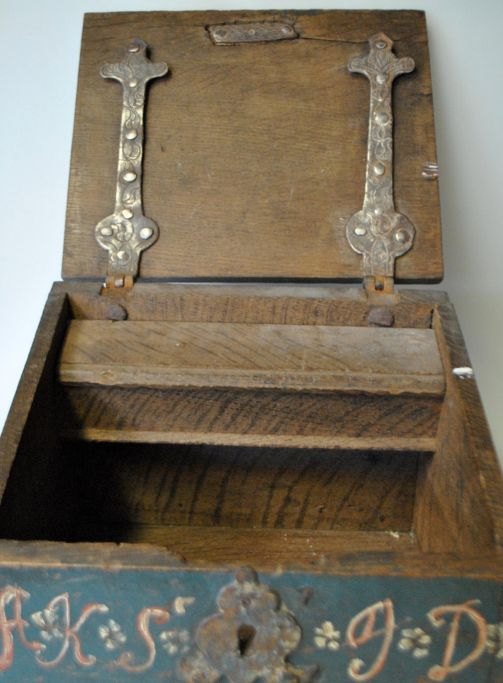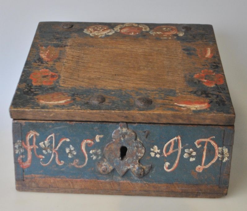 Barokt bemalet syskrin, 18. årh. Danmark. Bemalet egetræ med roser og valmuer. Med bogstaverne: AKS JD. Skråstillet låg. Med smedede jernbeslag. Indvendig med læddike. H: 18 cm. B.: 24 cm. D.: 18,5 cm.