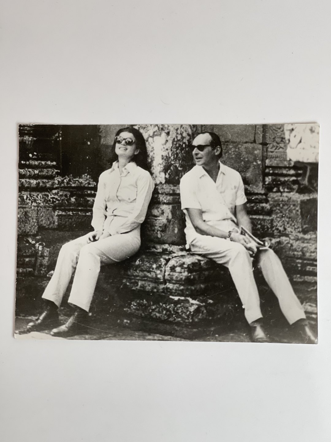 Fotografieret viser Jackie Kennedy og britten Lord Harlech siddende sammen foran et tempel i Cambodia.