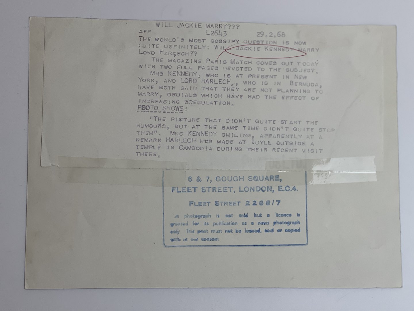 "The picture that didn't quite start the rumours, but at the same time didn't quite stop them". Mrs Kennedy smiling, apparently at a remark Harlech has made at idyll outside a temple in Cambodia during their recent visit there."