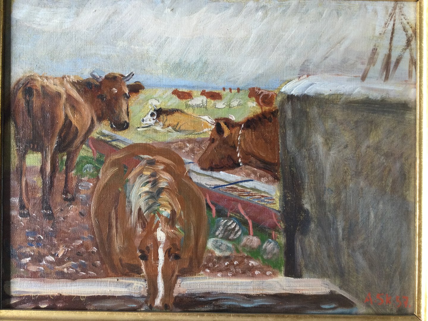 Maleri af Axel Skjelborg - Heste og køer bed Gammelgårds Brønd, Saltholm 1957.