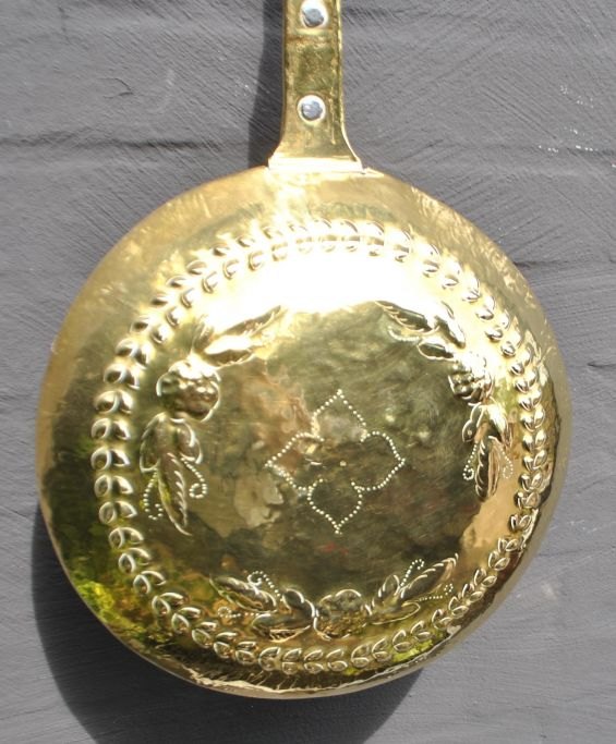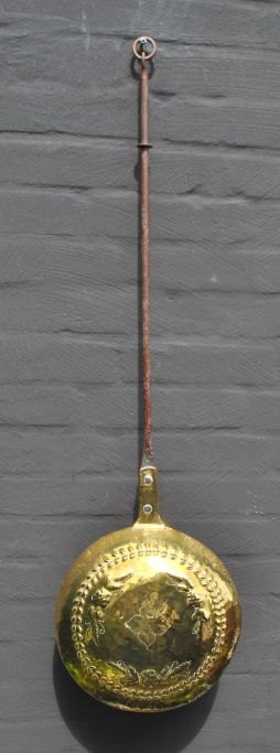 Varme bækken, barok, 18. årh. Låg dekoreret med blomster. Med jern håndtag. Stemplet. Bækken diameter: 28 cm. H.: 11 cm. L: 93 cm.