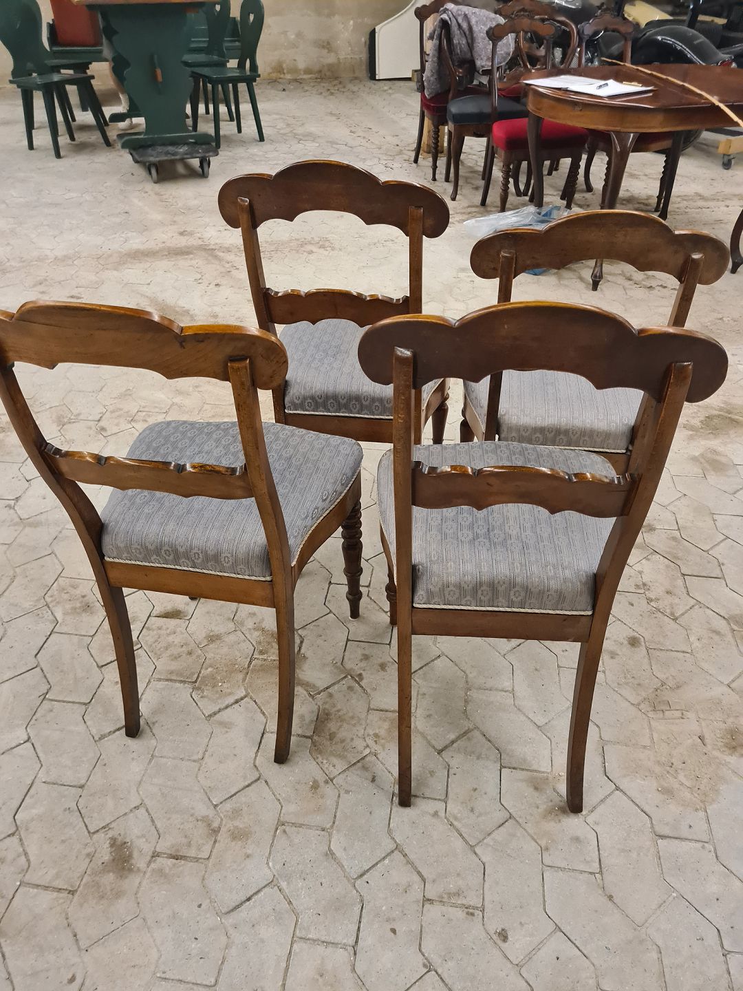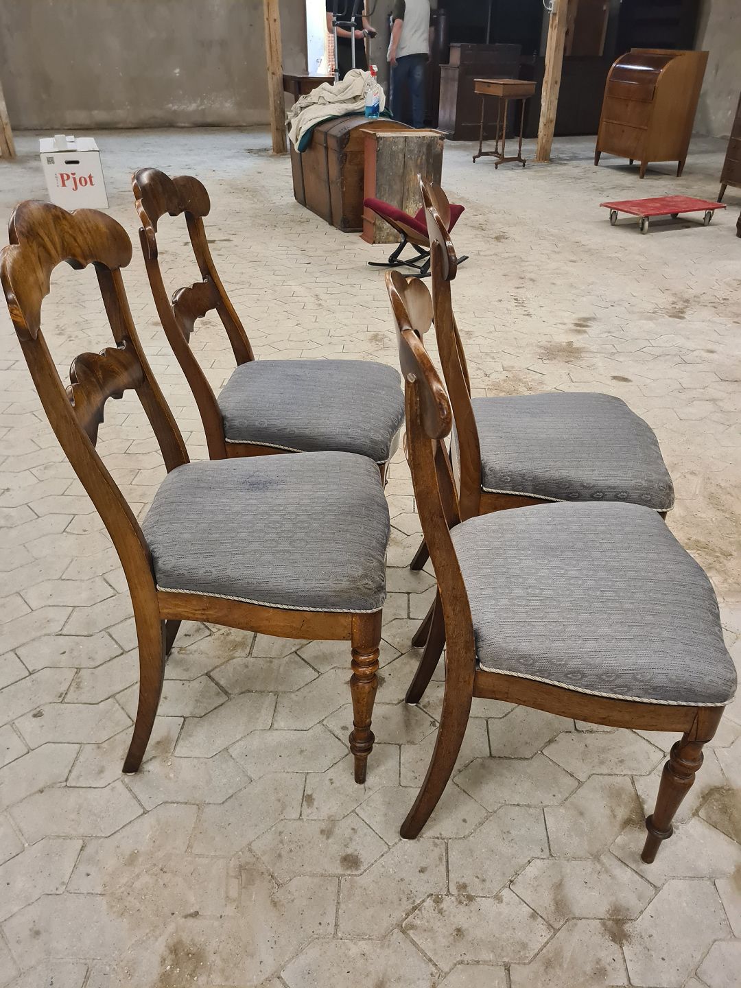 4 salonstole i mahogni og blå sæder fra 1920´erne. Fremstår gode og stabile uden de store brugsspor.