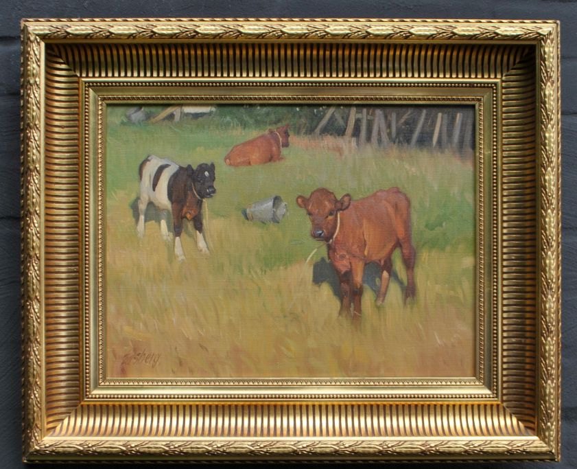 Edsberg, Knud (1911 - 2003) Danmark: Kalve på en mark. Olie på lærred. Signeret. 30 x 40 cm.
