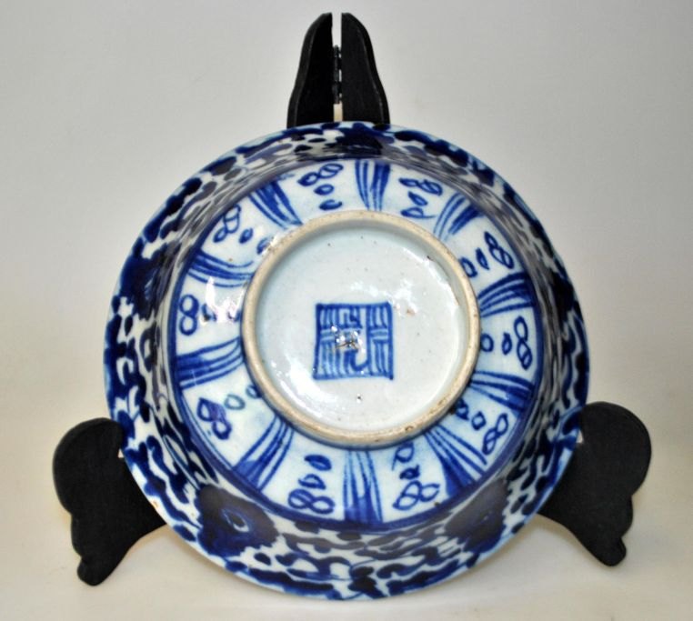 Blå/hvid skål, Kina, 19. årh. Med talrige hånddekorationer ind- og udvendig. På lille standrand. Stemplet. H.: 6.8 cm. Dia.: 16,5 cm.