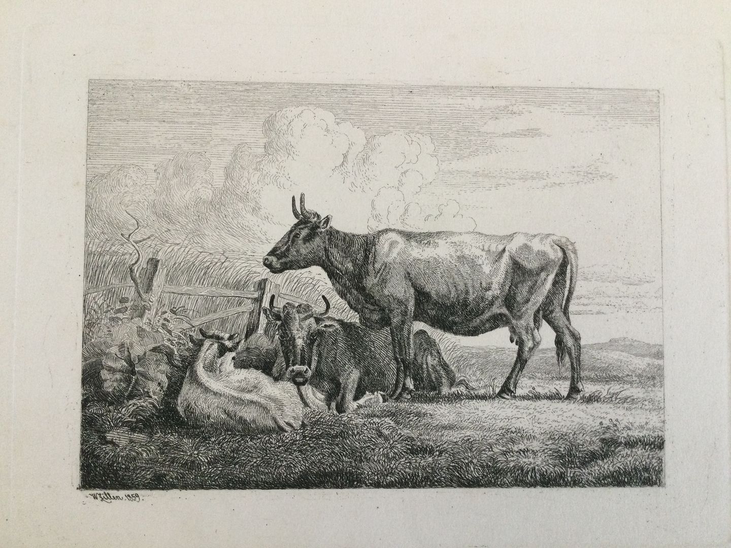 Radering af Johannes Vilhelm Zillen 1859 - Køer ved et gærde.