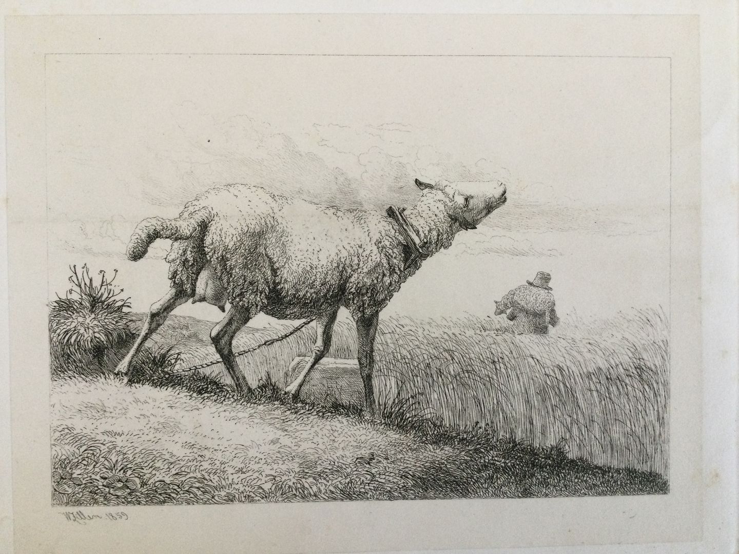 Radering af Johannes Vilhelm Zillen 1859 - Får og mand med lam.