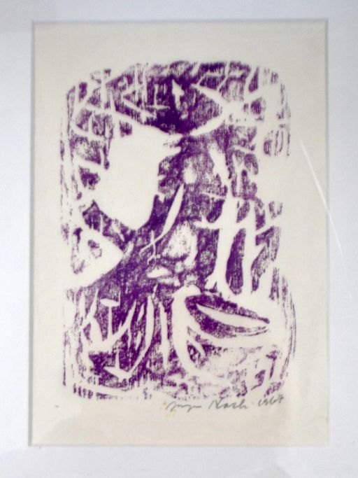 Nash, Jørgen (1920 - 2004) Danmark/Sverige: Hyldest til Den lille Havfrue.  Træsnit med violet farve. Papir. Signeret 1967. 23 x 16 cm. UNIKA.
