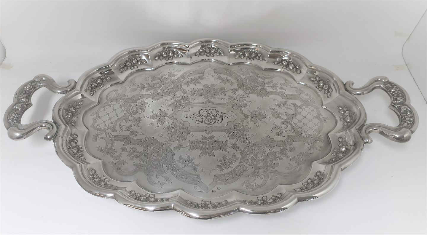 Østrig. J. Reiner. Stor sølv serveringsbakke med håndtag (812). Produceret 1861. Længde 62. Bredde 37 cm.