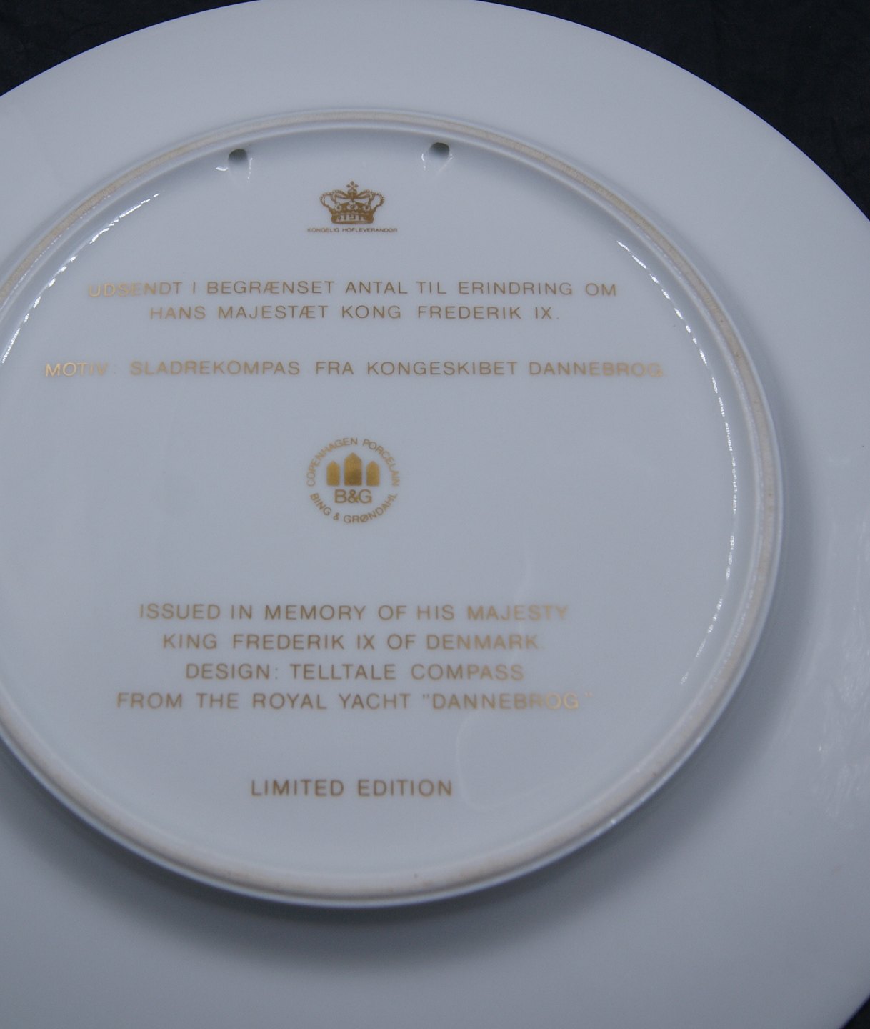 Bing & Grøndahl Mindeplatte, udsendt i begrænset antal til erindring om Hans Majestæt Kong Fredrik IX 11.3.1899 - 14.1.1972. Den er i rigtig pæn stand med lidt slid på 2 bogstaver (E & R).