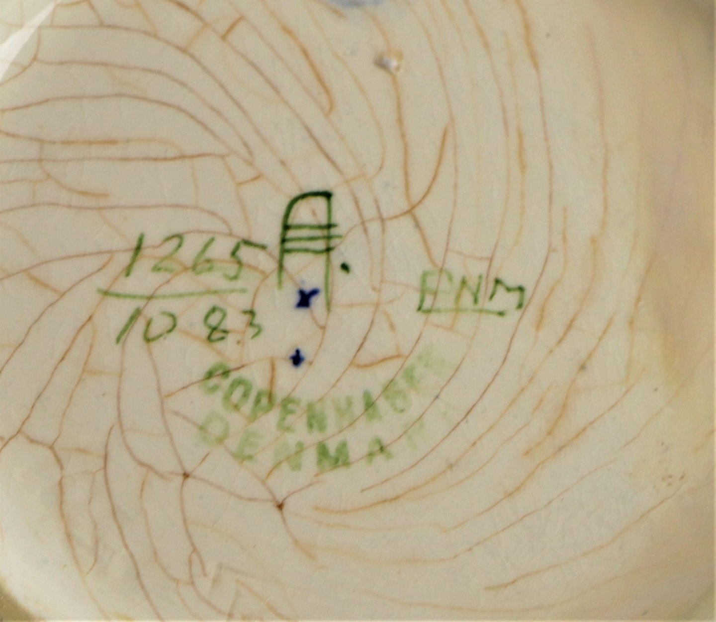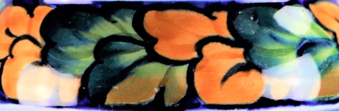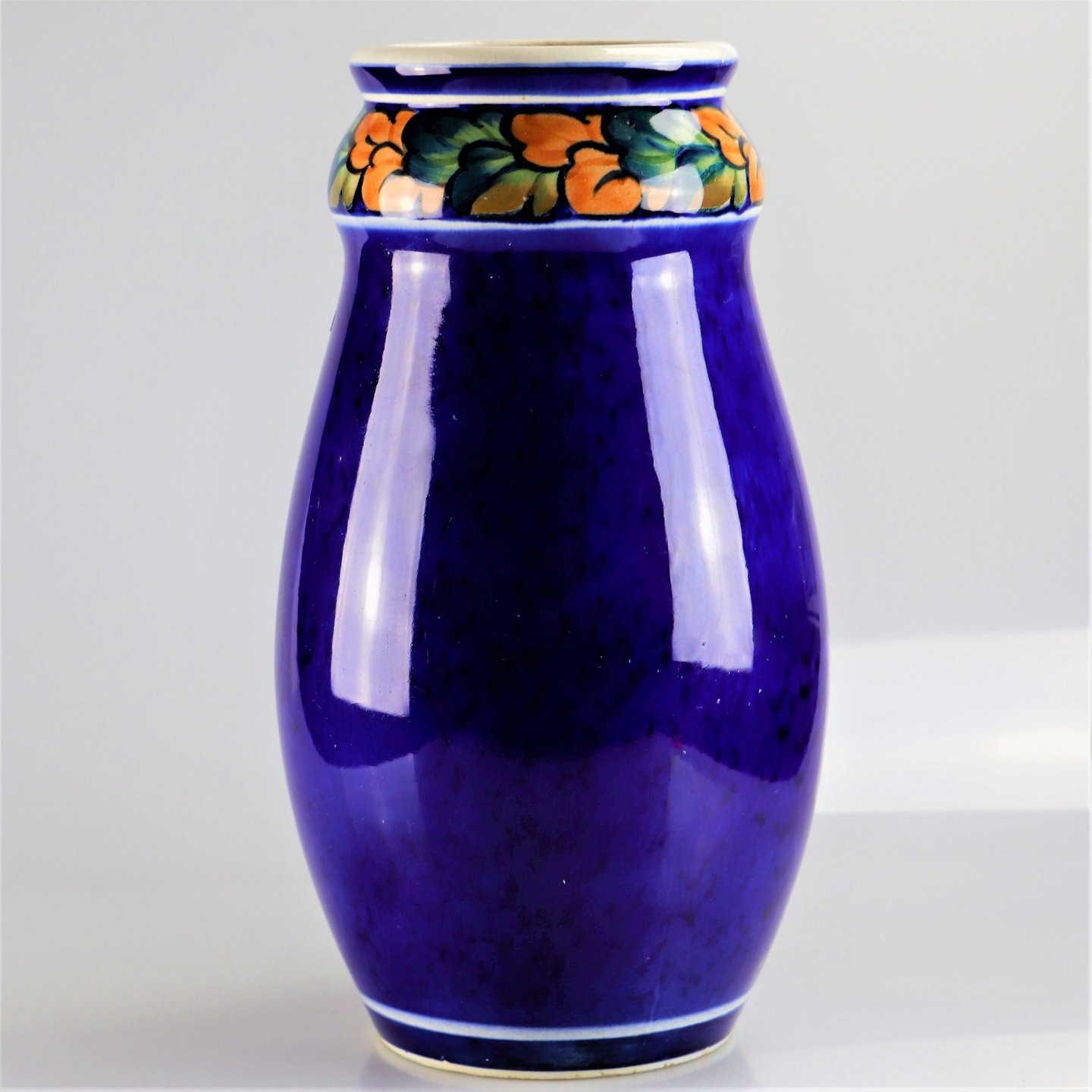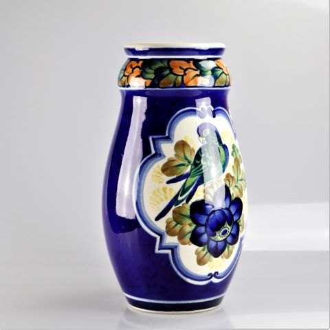 Høj flot vase med grøn papegøje og en blå blomst. Øverst en frise med blade i flere farver.