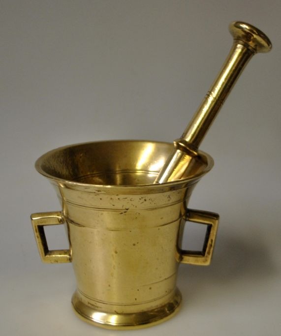 Brass mortar with pistil, 1872, Denmark. Corpus with two handles. On the side inscription: Maren A. S 1872. Height .: 10 cm. Length of pistil: 19 cm.