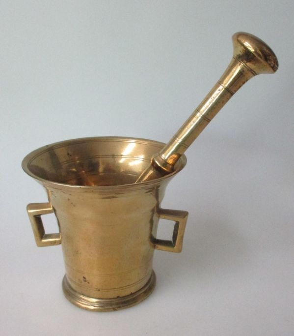Dansk messing morter med pistil, 19. årh. Med to hanke. Højde.: 10 cm. Pistil længde: 20,5 cm.