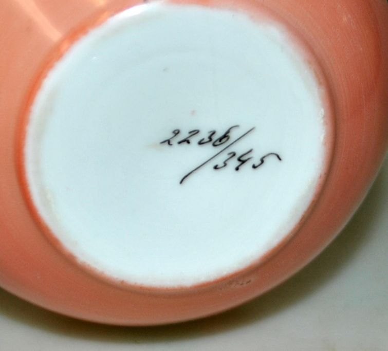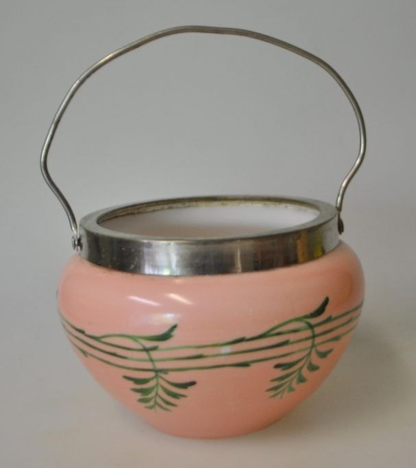 Sukkerskål, Fyens Glasværk, 1910. Danmark. Opalhvidt glas med påbrændt dekoration i emalje på rosa bund. Stemplet: 2236/345. Monteret med metalbeslag. H.: 8 cm.