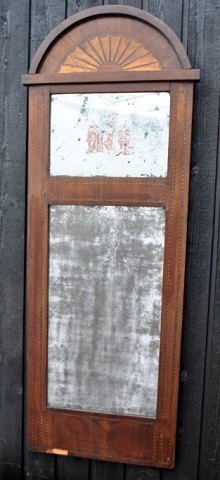 Dansk senempire spejl i mahogni med intarsia, 19. årh. Topstykke med vifte. To spejle og indlægninger i siderne. H.: 124 cm. B.: 47 cm.