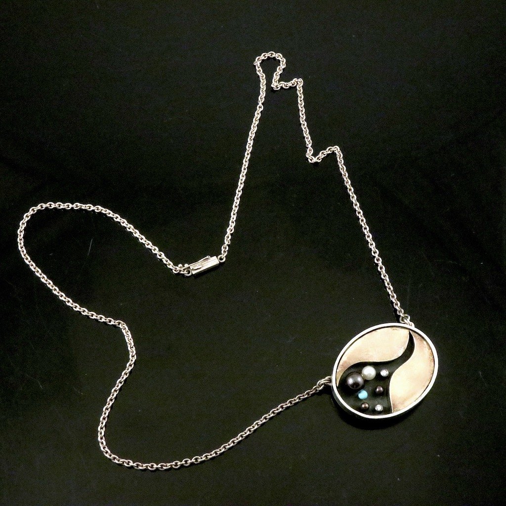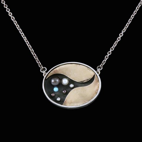 Ole Waldemar Jacobsen. Vedhæng i sterling sølv med 18k guld, turkis og brillanter.