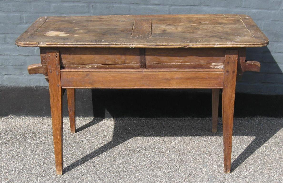 Bager table, southern Germany, ca.1800. With trunk and carrying handle. Oak and elm. With rounded corners. H: 75 cm. D: 62 cm. L .: 123 cm. This type of table was also used when you served unleavened bread in connection with Catholic celebrations. It is thus a showing table for bread.