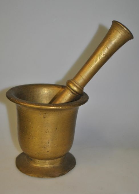 Large brass mortar with foot and pestle, 18th century, Pillemark, Samsø, Denmark. Height.: 13.5 cm. Length of pistil: 25.5 xm.