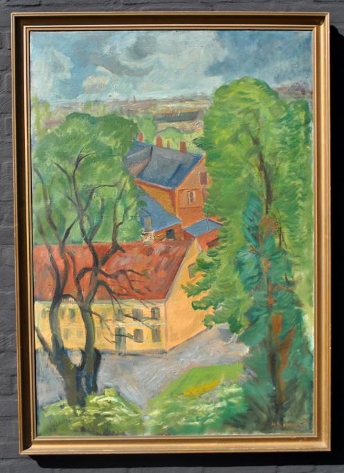 Kragh Pedersen, Hjalmar Alexander (1883 - 1962) Danmark: Udsigt over byens tage. København. Olie på lærred. Signeret. 130 x 89 cm.