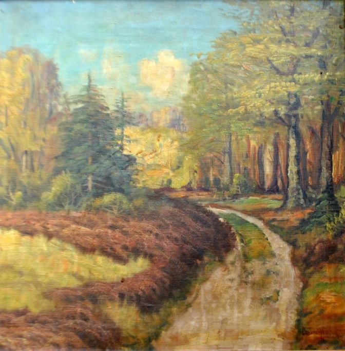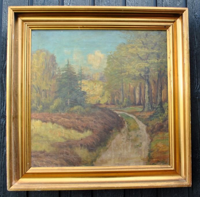 Virklund, Christian Jensen (1853 - 1938) Danmark: En vej i en skov. Olie på lærred. Signeret. 1931. 45 x 45 cm.