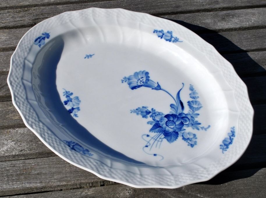 Royal Copenhagen, serveringsfad, blå blomst svejfet, 10/1556, 20. årh. København, Danmark. Stemplet. L.: 36 cm. B.: 29 cm.