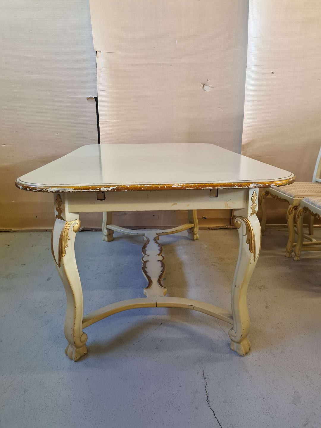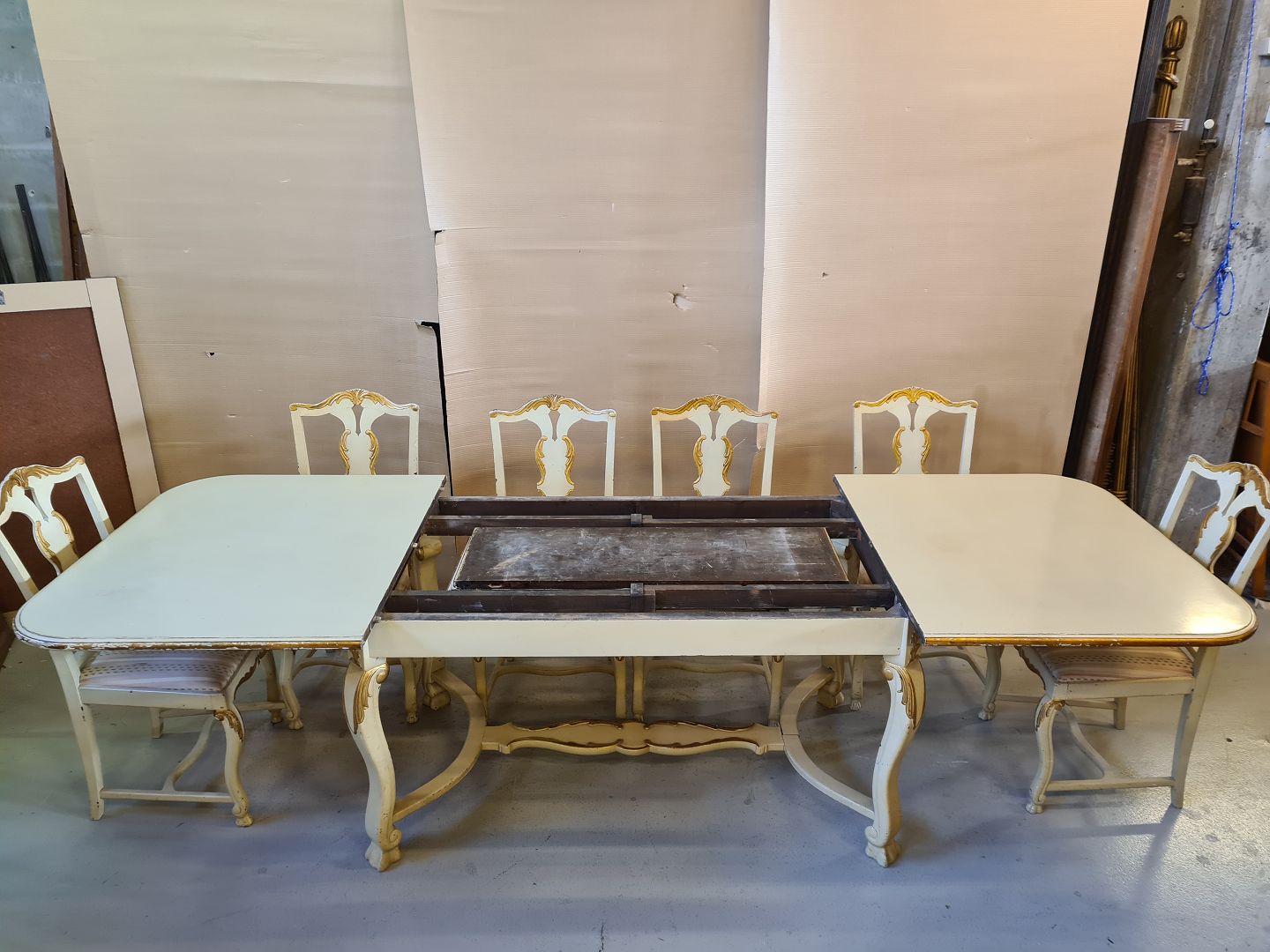 Spisebord med 3 tillægsplader og 6 stole, fra 1920erne.