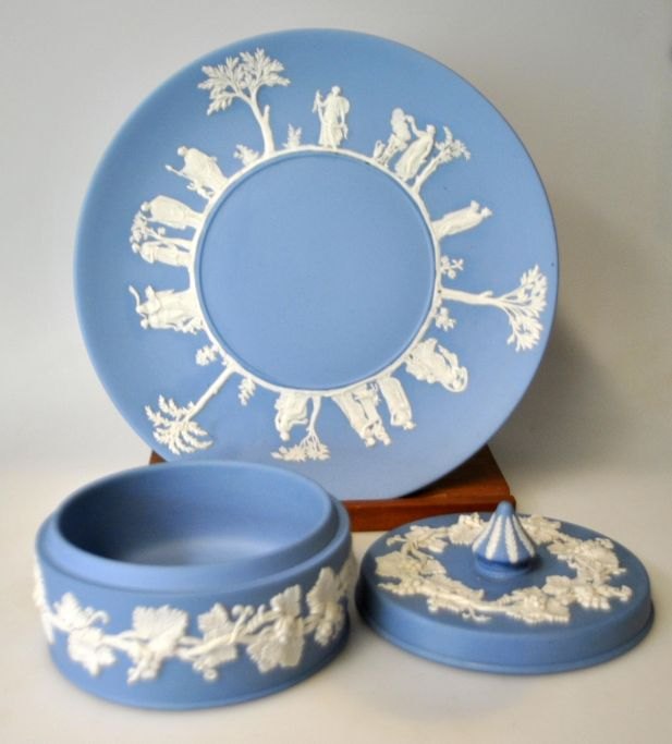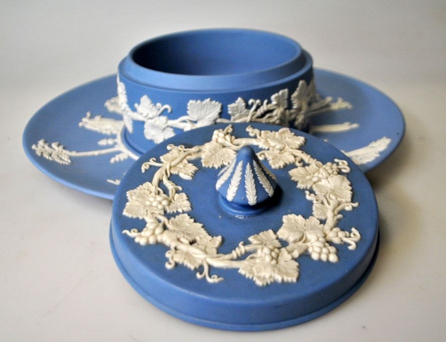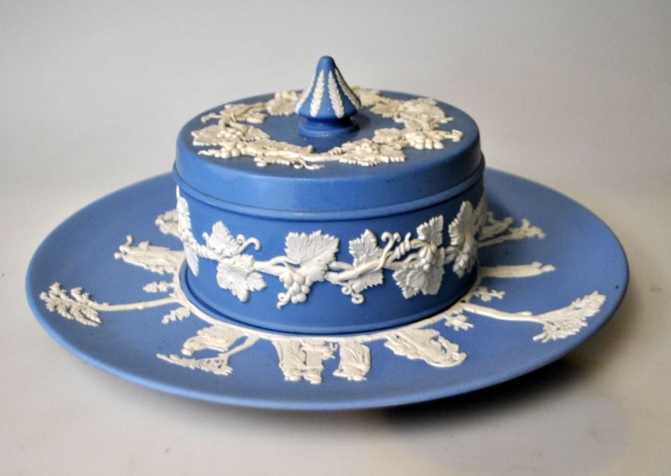 Wedgewood blue jasper bisquit porcelain lid bowl with dish, 20th century England.