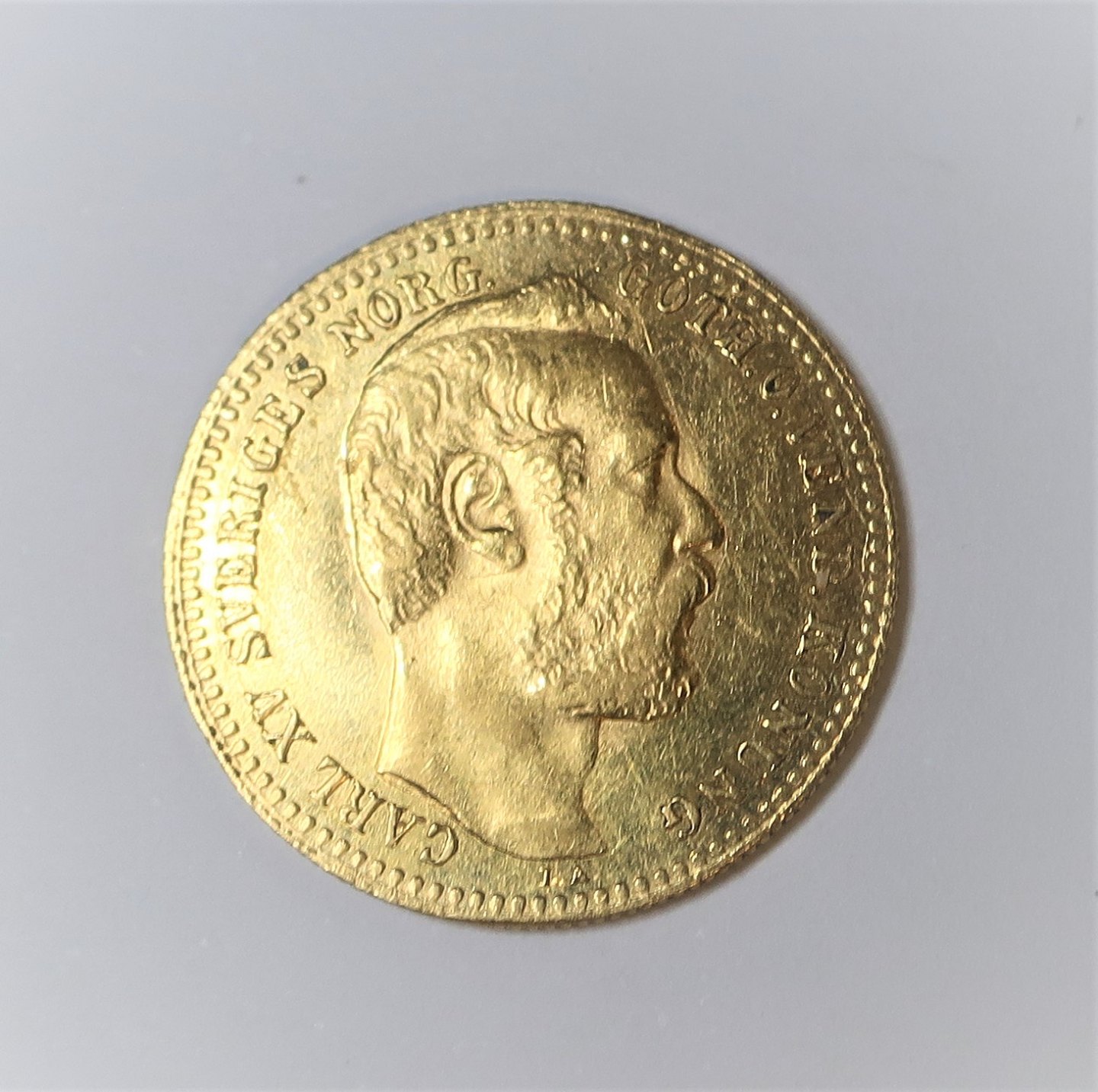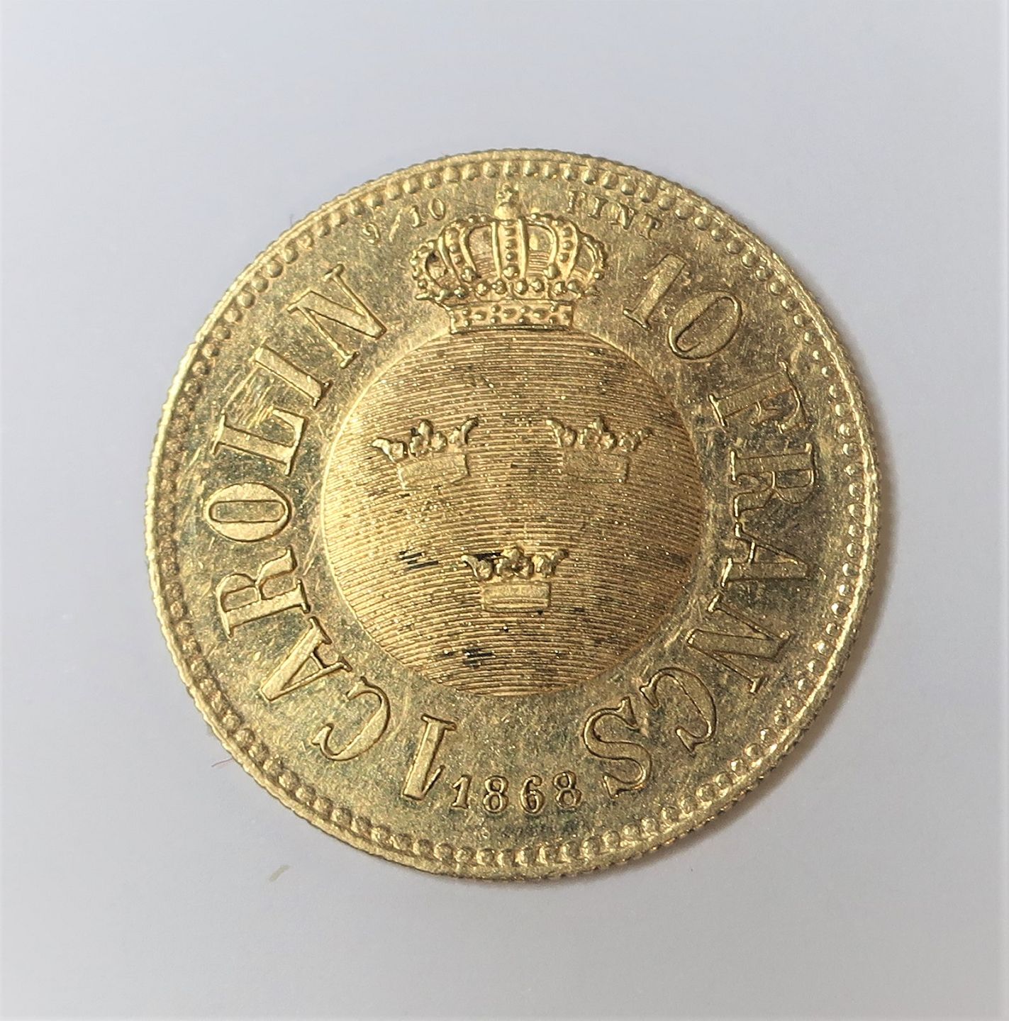 Sverige. Guld 10 francs, 1 Carolin fra 1868.