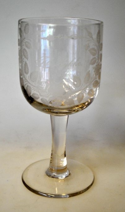 Erindringsglas, "Til lykke", Toddy glas eller ølglas. Afsprængt kumme på glat stilk. På kumme ætset blomsterkrans. I Kastrups katalog 1910. H: 16,5 cm.