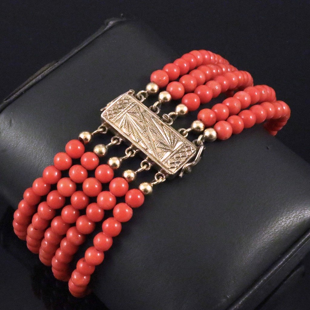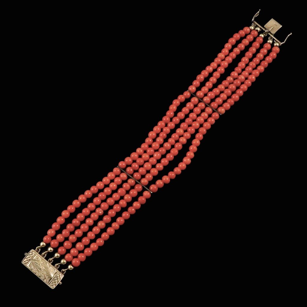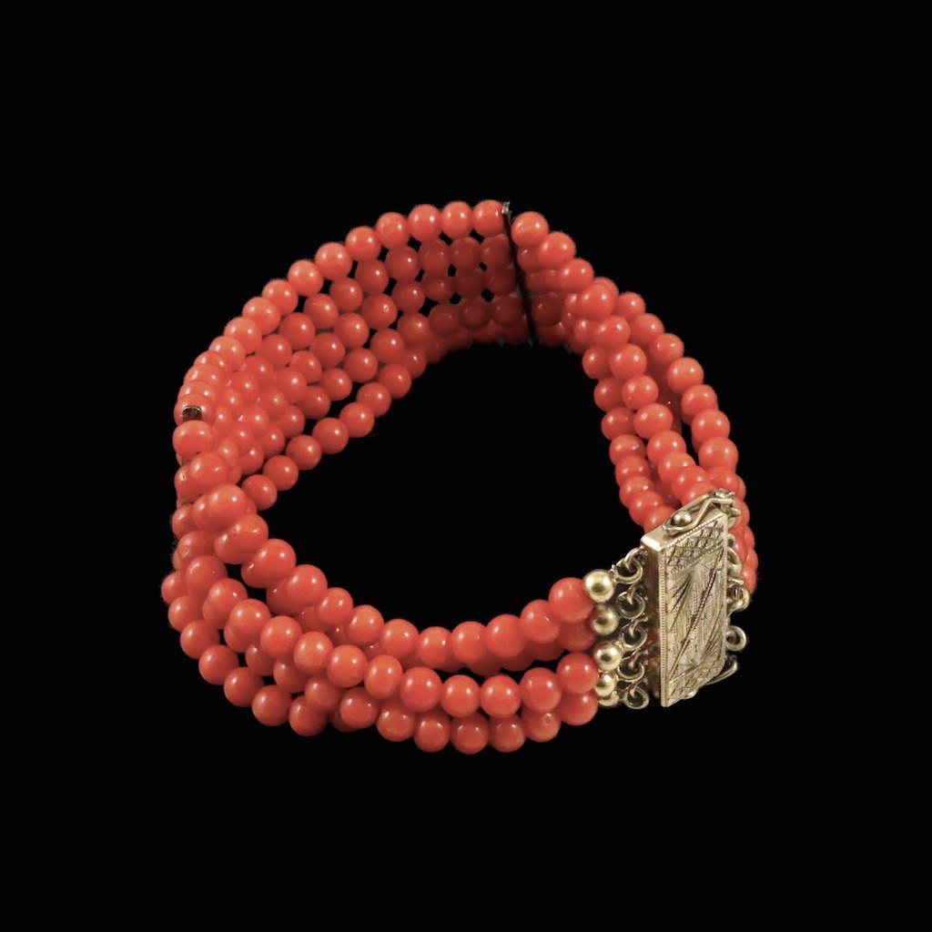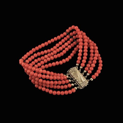 Fem-radet koral armbåndt med forgyldt sølvlås.