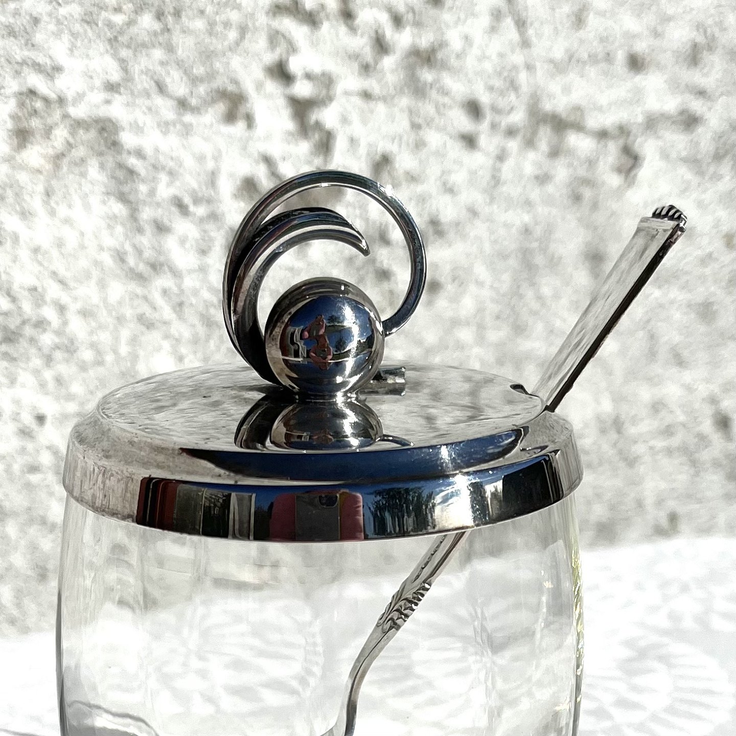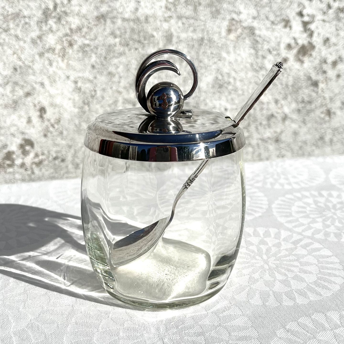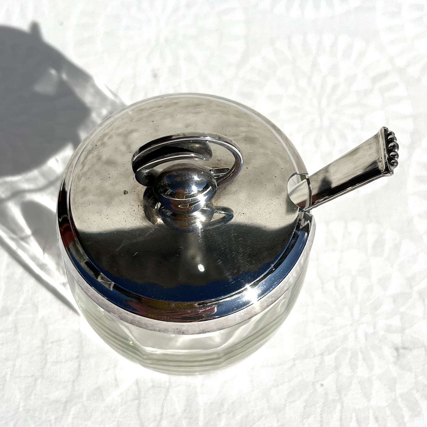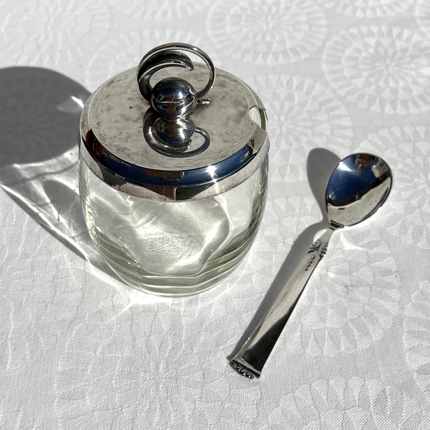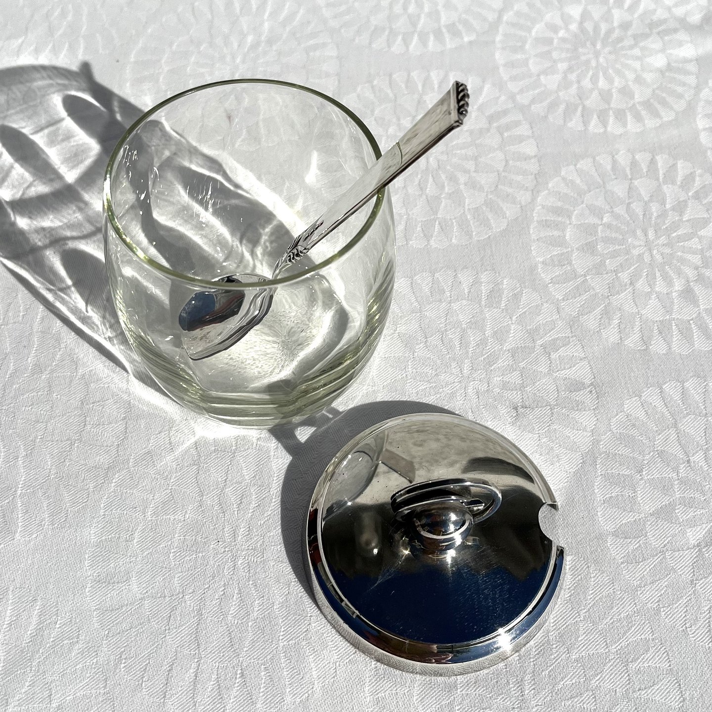 Marmelade glas med sølvpletlåg, 12cm høj, 7,5cm i diameter *Perfekt stand*