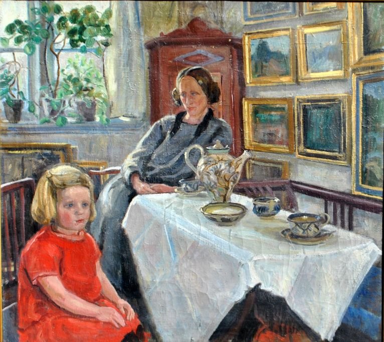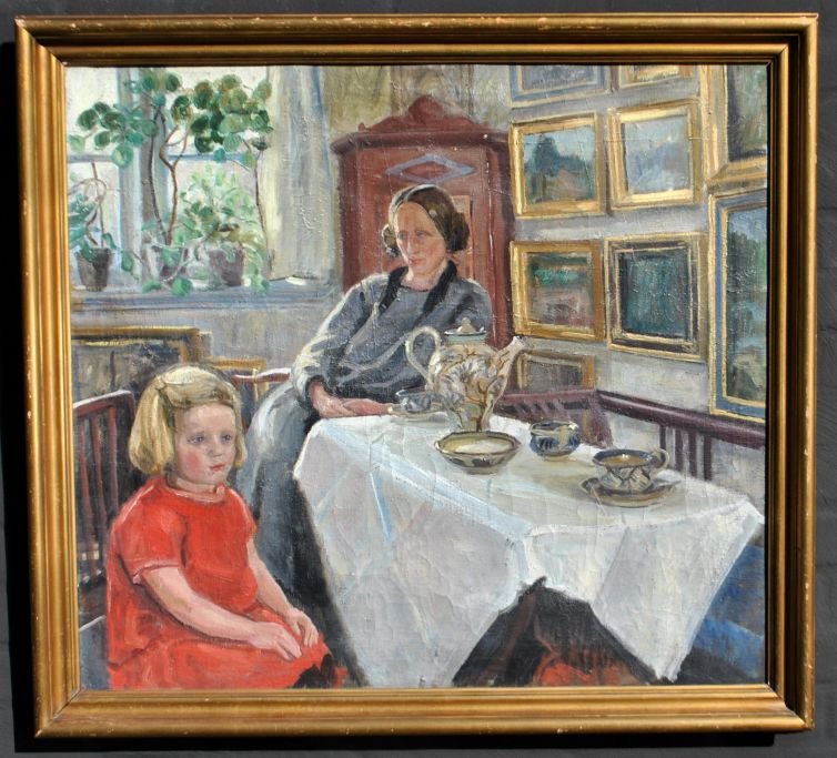 Pedersen, Erik Gotlieb (1888 - 1947) Danmark. Stueinteriør med kvinde og barn ved thebordet. Signeret 1926. Olie på lærred. 73 x 81 cm.