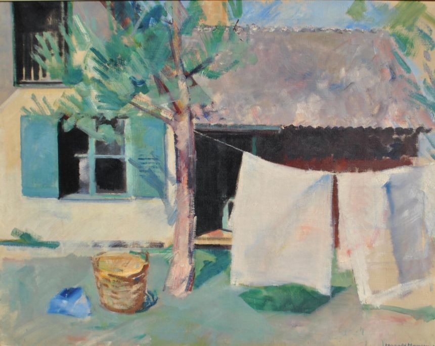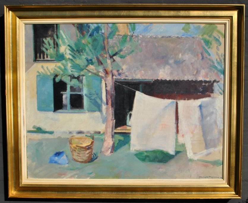 Hansen, Harald (1890 - 1967) Danmark: Vasketøjet hænger til tørre. Olie på lærred. Signeret 1939. 85 x 105 cm.