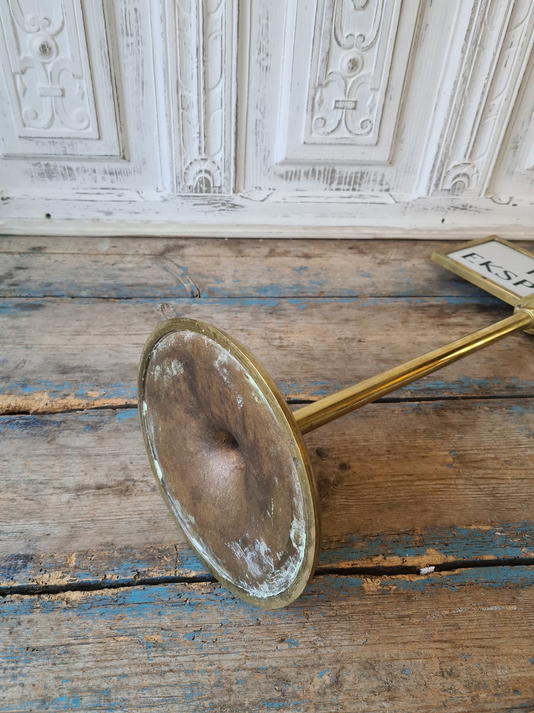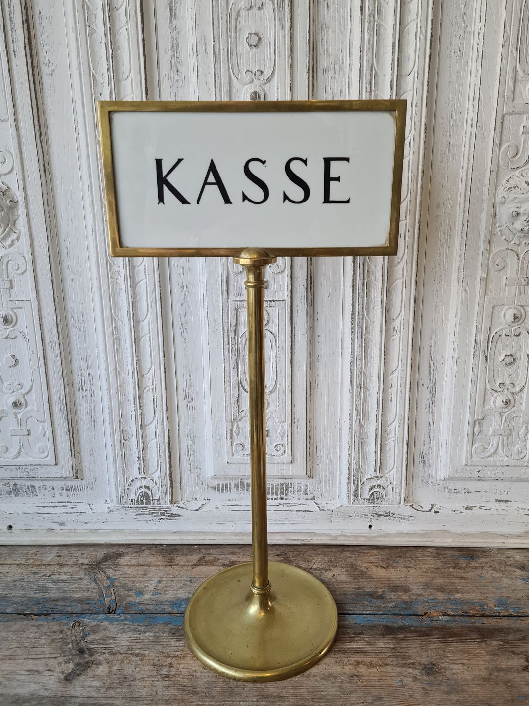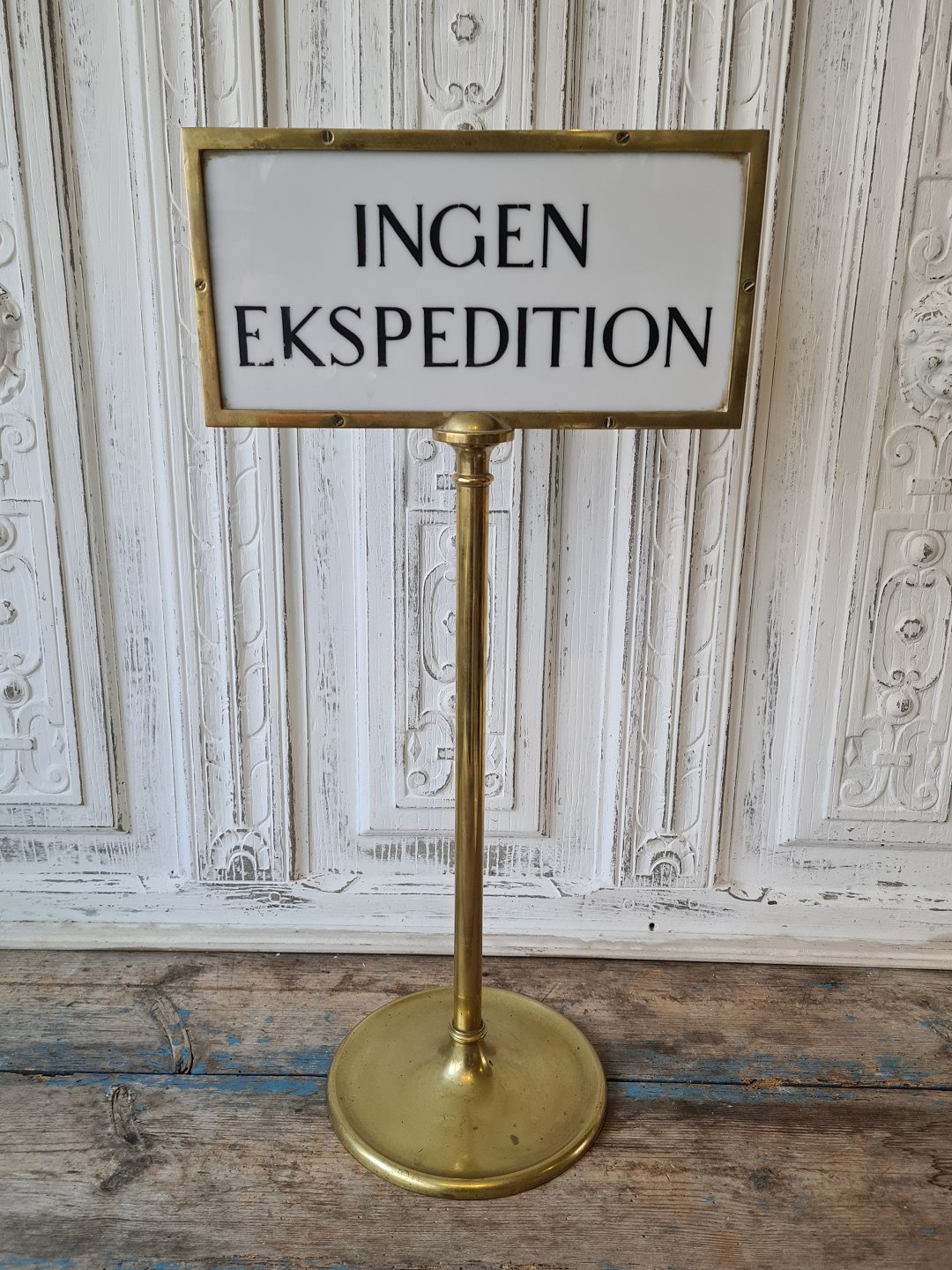 Stort messingskilt. Skiltet stammer fra en bank. Teksten er malet på en porcelæns plade.