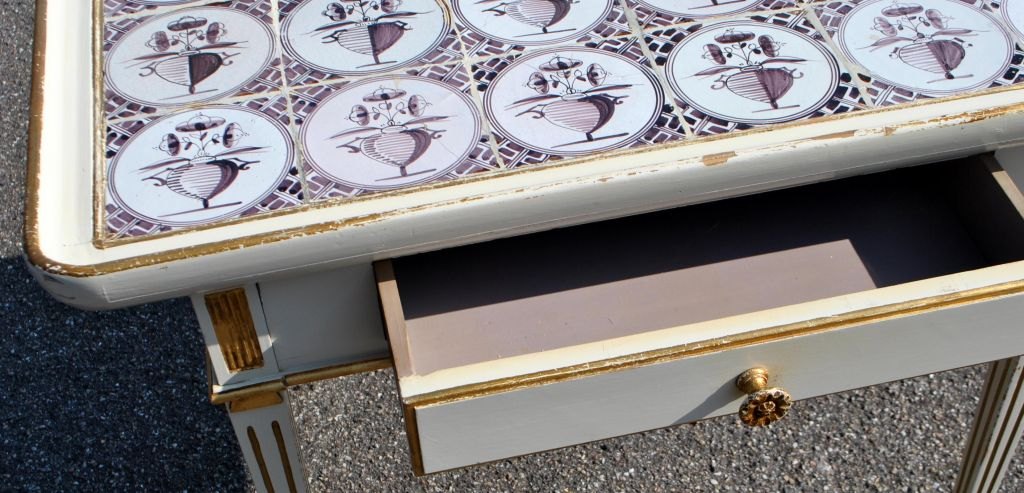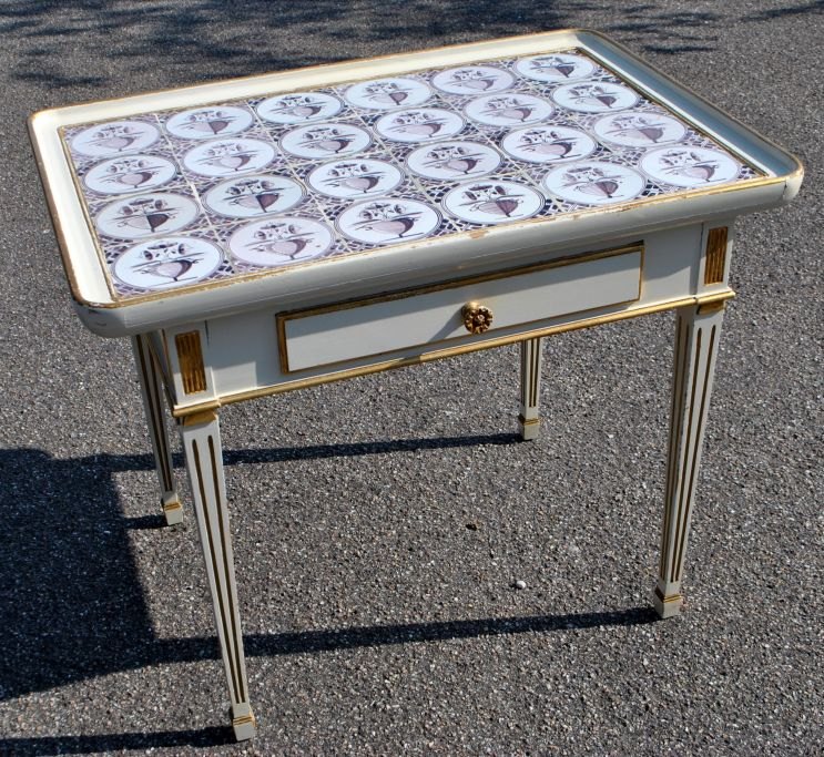 Painted tile table, 20th century in Louis XVI style with 24 Dutch manganese colored antique tiles with "flower pot motif", mid 19th century. H. 73 cm. L.: 88 cm. D.: 62 cm. With drawer