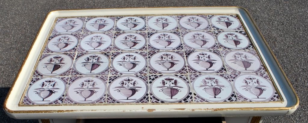Painted tile table, 20th century in Louis XVI style with 24 Dutch manganese colored antique tiles
