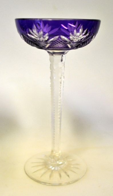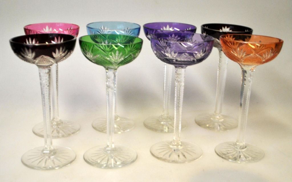 Sæt på 8 Bömiske slebne likør krystalglas med farvede kummer, 20. årh.