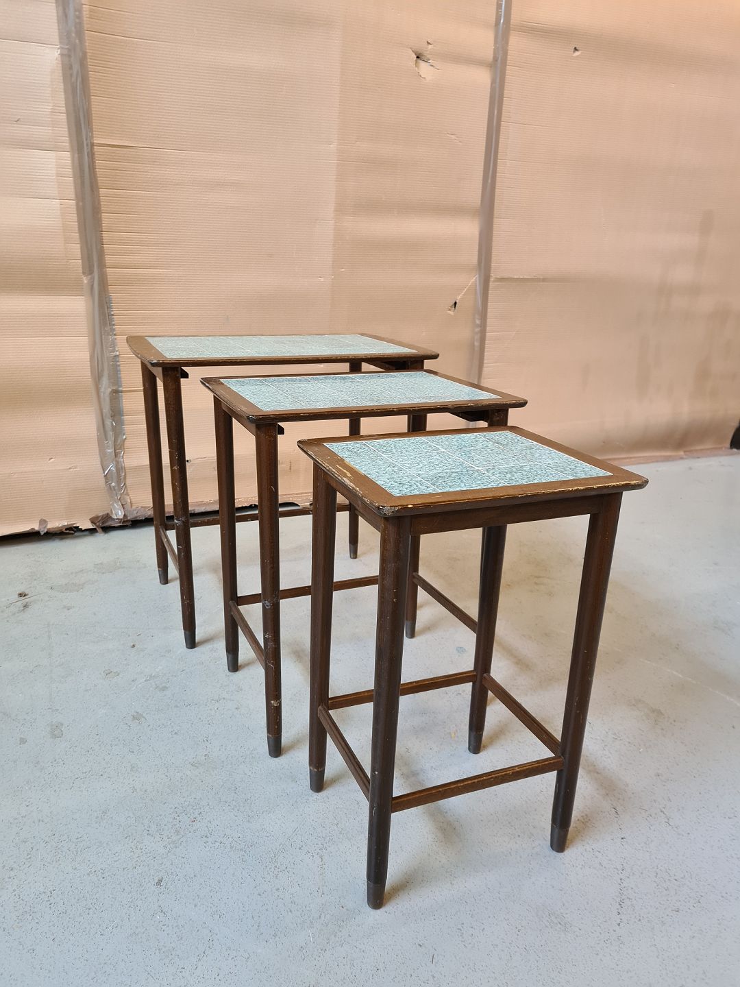 3 Indskudsborde i nødetræ med kakler, fra 1950erne.