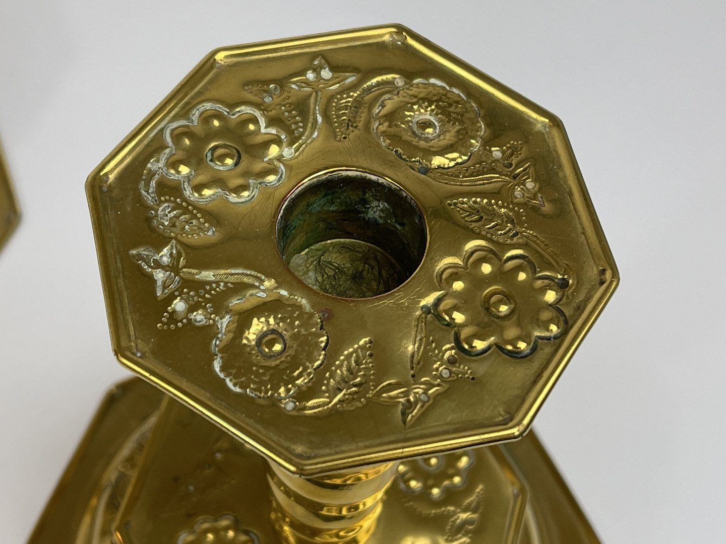 Par smukke, ottekantede lysestager, barok-form, messingblik af høj kvalitet med blomster og blade i ranker