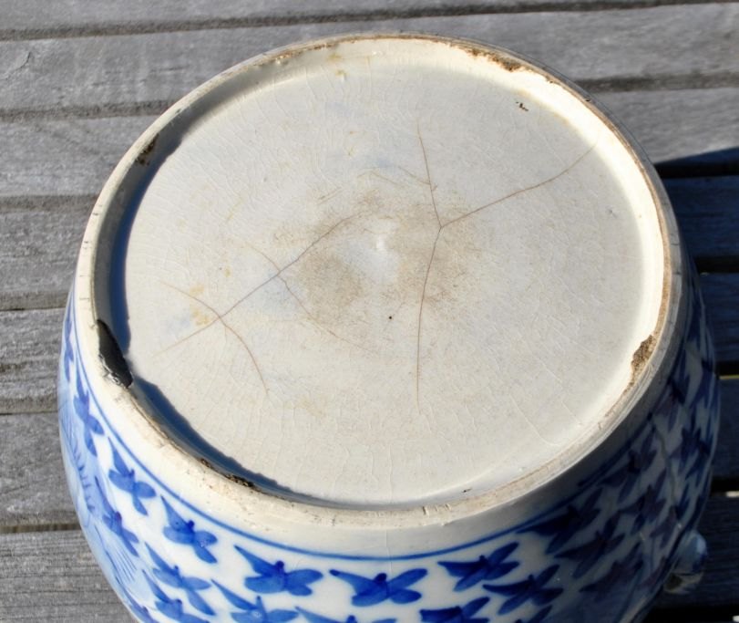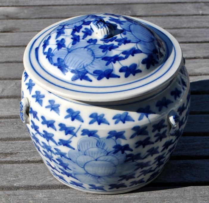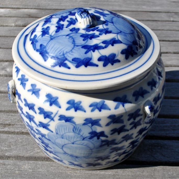 Kinesisk blå/hvid dekoreret porcelæns lågkrukke, 19. årh.