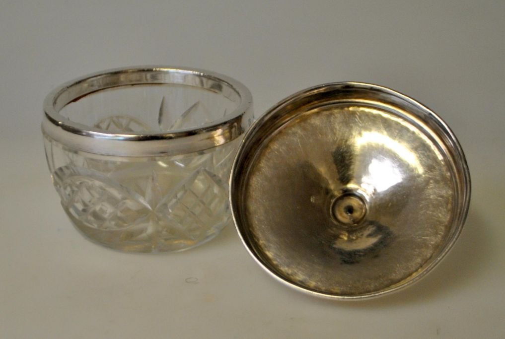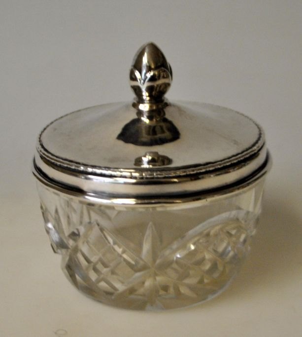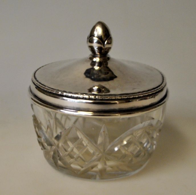 Crystal bowl with silver lid, 1917, Denmark. Lid knob in the shape of a flower bud. Stamped. Height: 8 cm. Dia.: 8 cm.