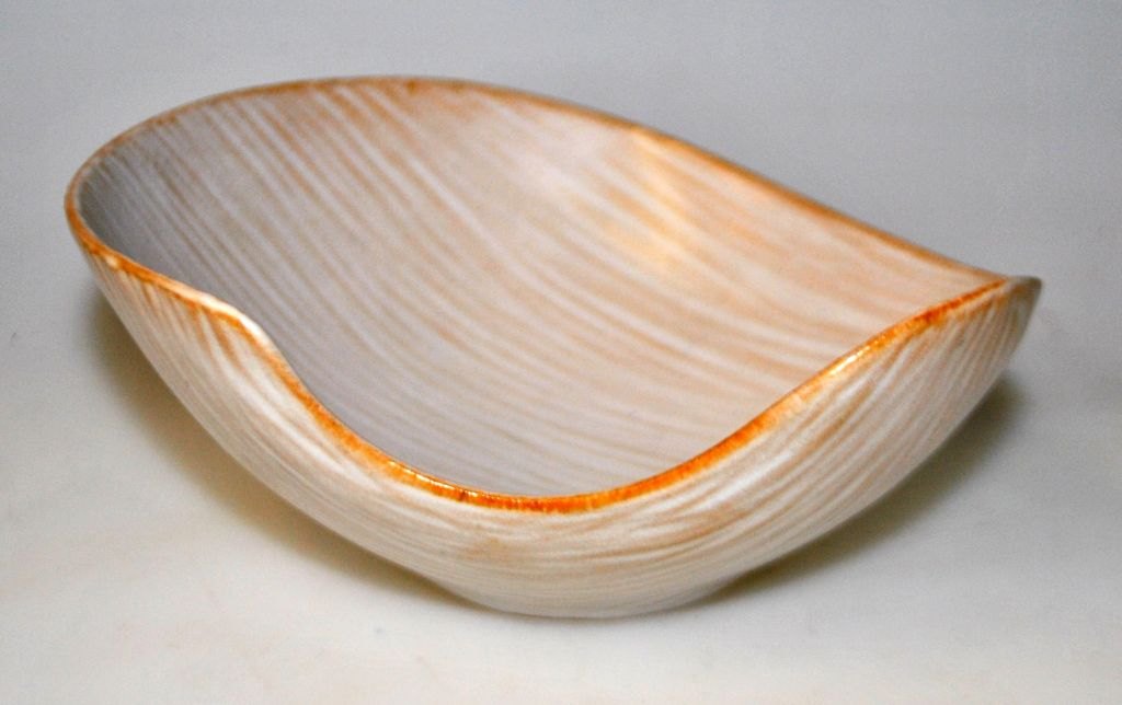 Nielsen, Ejvind (1916 - 1988) Danmark: Keramik skål. Rødler med hvid glasur i striber. Signeret. L: 14,5 cm. H.: 5.8 cm.