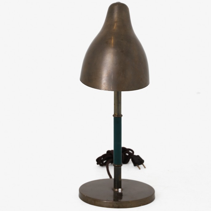 Bordlampe i patineret messing og grønt kaneleret håndtag.