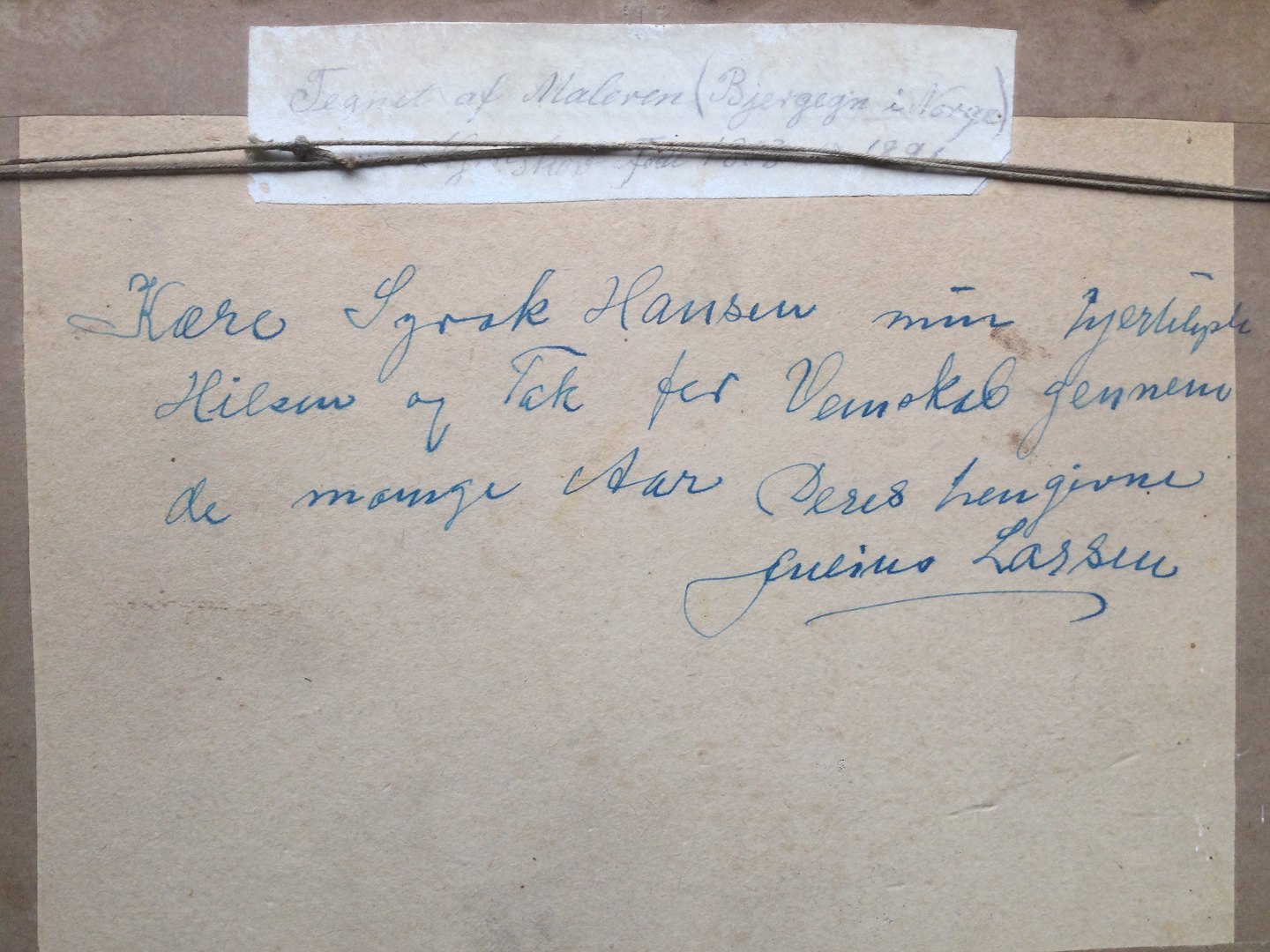 Bagpå dedikation: Fra Julius Larsen til Syrak Hansen.