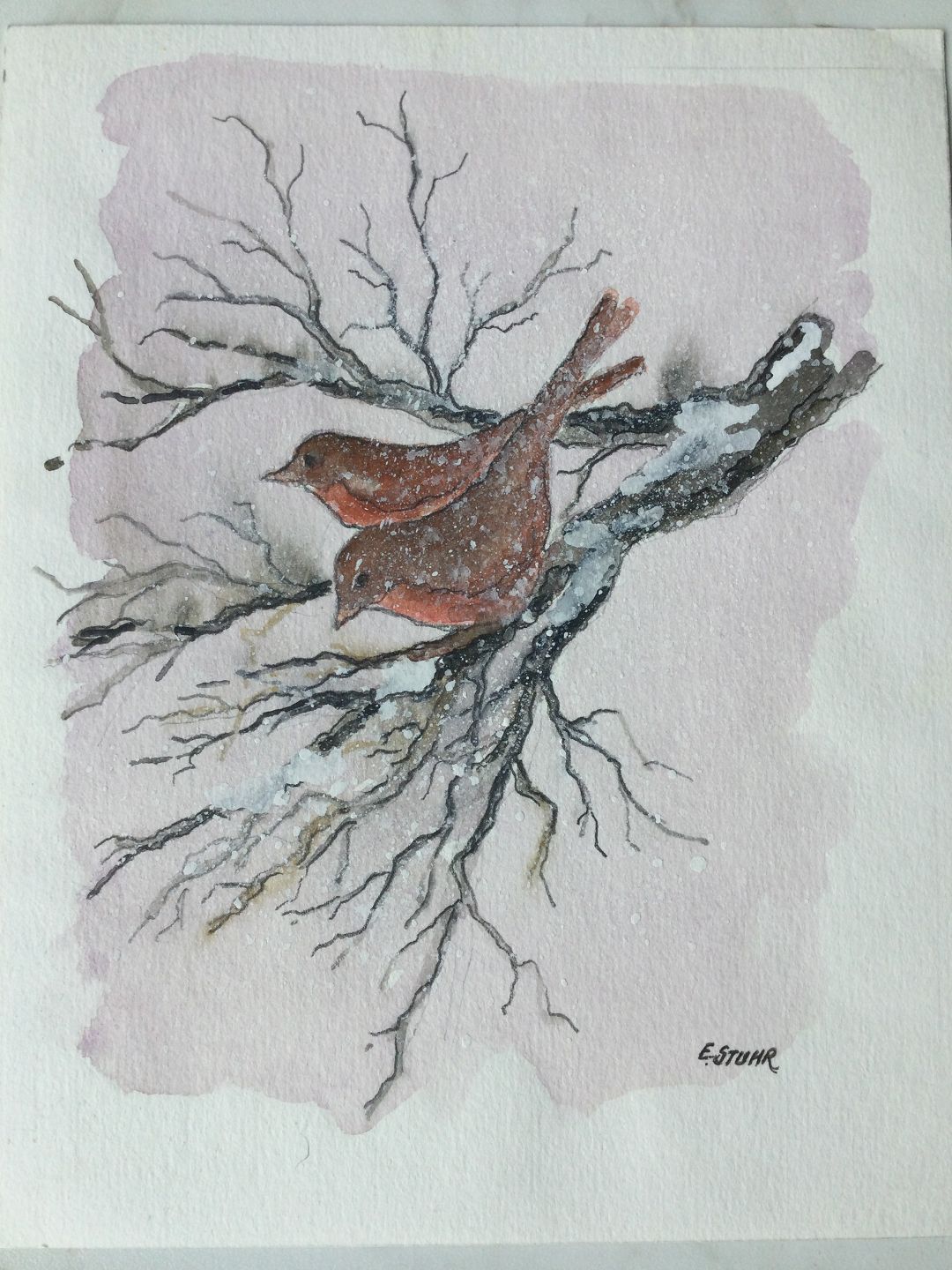 Akvarel af Erik Stuhr - 2 fugle på gren, vinter.
