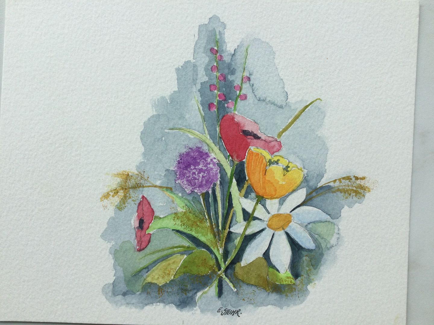 Akvarel af Erik Stuhr - Buket markblomster.