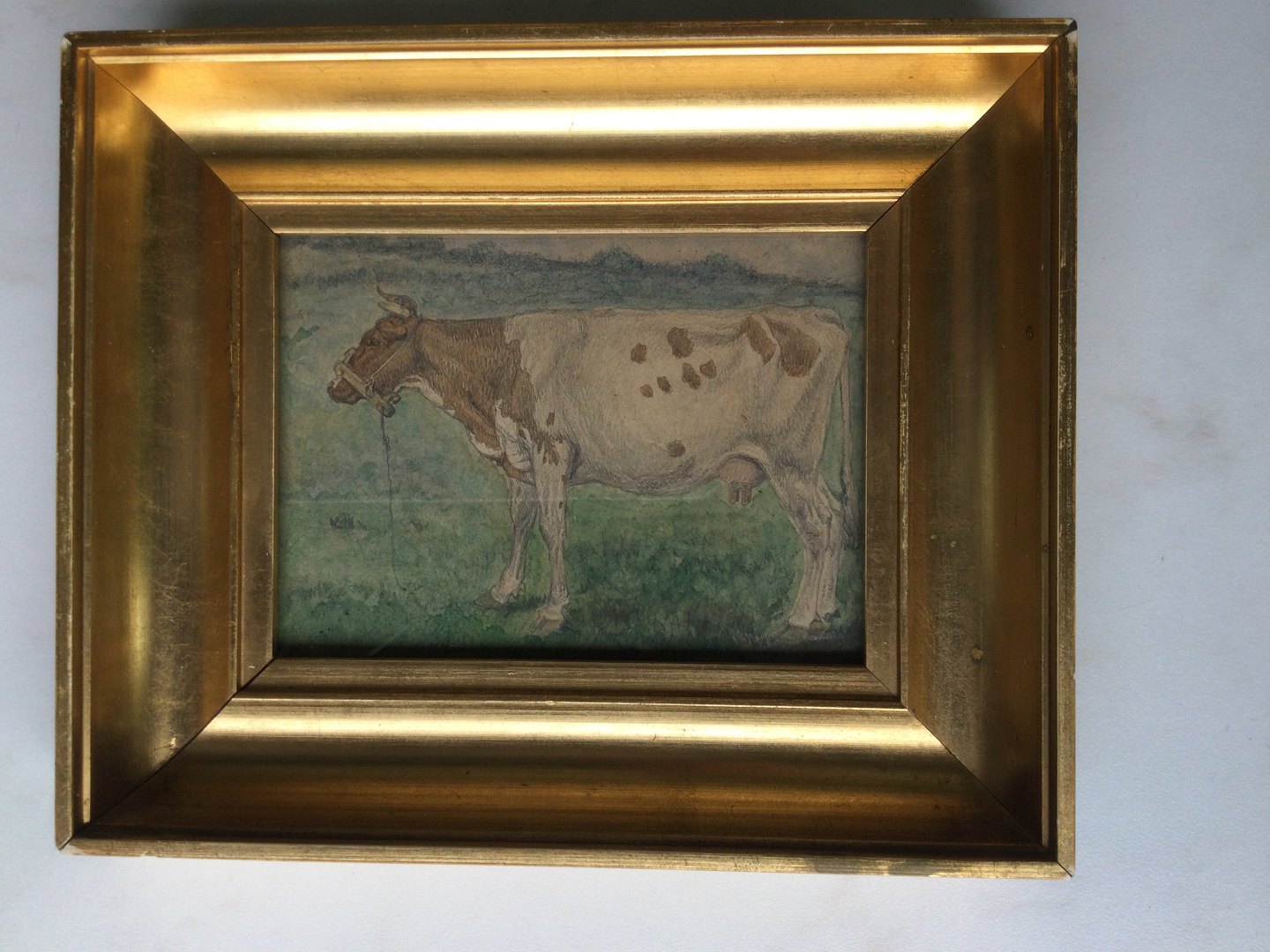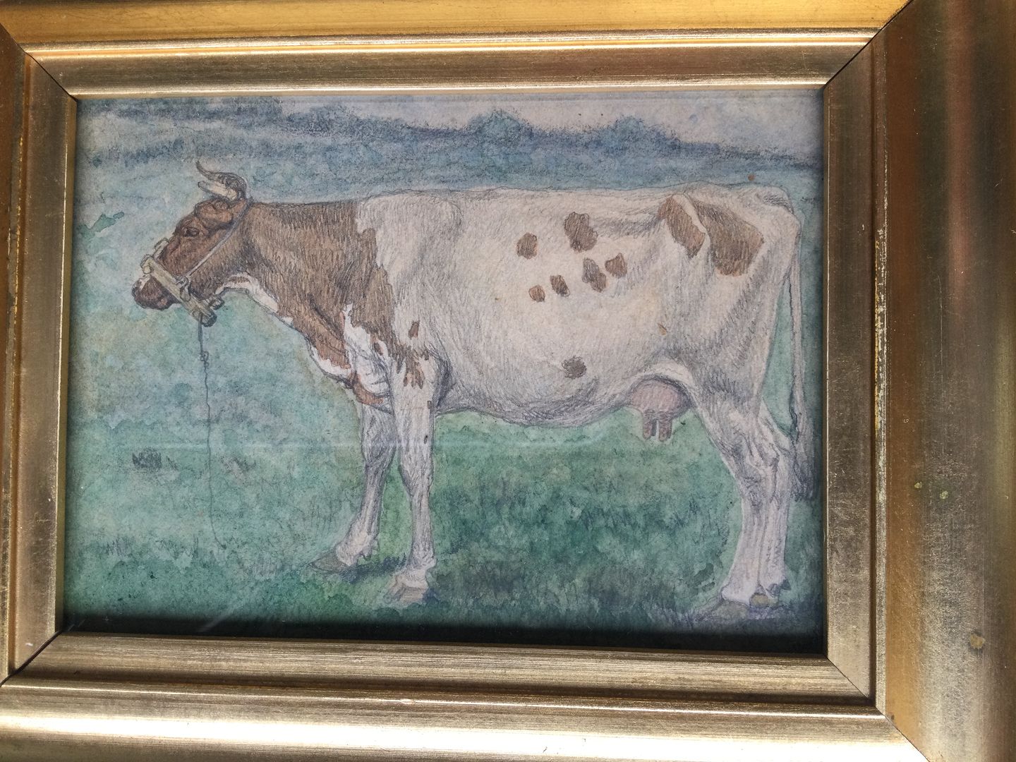 Akvarel af Adolph Kittendorff - En rødbroget ko på mark.